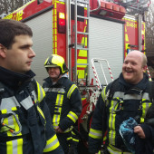 Ein piepender Rauchmelder in einem Mehrfamilienhaus alarmierte am Samstagnachmittag aufmerksame Nachbarn und diese die Feuerwehr. Mit einem ganzen Löschzug im Gespann rückte Wehrführer Lars Heuer aus. Mit dem KdoW war er rasch vor Ort, konnte bereits vor dem Eintreffen der Großfahrzeuge die Lage erkunden. In einer Wohnung piepte ein Rauchmelder, zunächst musste von einer Rauchentwicklung und somit einem möglichen Feuer im Inneren der Wohnung ausgegangen werden. Mit Spezialwerkzeug öffnete der Wassertrupp die Eingangstür während der Angriffstrupp in Bereitstellung vor dem Gebäude wartete. Kurze Zeit Später Entwarnung – Kein Rauch, kein Feuer. Die Kräfte rückten wieder ein und übergaben die Einsatzstelle an die Polizei.