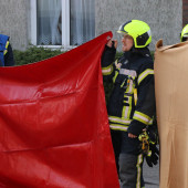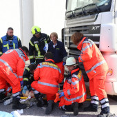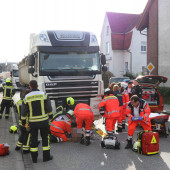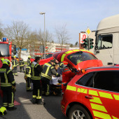Der zweite Einsatz am Freitagvormittag führte die Feuerwehr in die Hamburger Straße. „Gemeldet war eine eingeklemmte Person unter einem LKW“ so Wehrführer Lars Heuer. Binnen kürzester Zeit rückte das HLF aus. Der Angriffstrupp übernahm bis zum Eintreffen des Rettungsdienstes die Erstversorgung des Patienten und unterstützte diesen anschließend bei der Rettung der Person. Entgegen den ersten Meldungen war der Patient nicht unter dem voll beladenen LKW eingeklemmt. Zahlreiche Schaulustige blieben stehen, forderten zusätzliches Personal von TLF und LF, welches mit Decken und Planen den Arbeitsbereich vor neugierigen Blicken abschirmten. Wie es zu dem Unfall kam, ermittelt nun die Polizei. Der Patient wurde mit Notarztbegleitung in ein Krankenhaus transportiert. Für die Rettung und Unfallaufnahme blieb die Ortsdurchfahrt der Bundesstraße 5 kurzzeitig gesperrt.