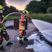 Auf ein Kleinfeuer wurde die 3. Gruppe der Lauenburger Feuerwehr aufmerksam, als sie von ihrem Übungsdienst Richtung Wache einrückten. An einer Werkstatt loderten auf dem Gelände Holz und Grünschnitt vor sich hin. Auch ein Teil des Buschwerk drumherum hatte bereits Feuer gefangen. - Das beim Dienstabend erlernte konnte gleich umgesetzt werden. So wurden das Kleinlöschgerät High-Press und ein C-Rohr zur Bramdbekämpfung eingesetzt. Schnell waren die Glutnester gelöscht und die Kräfte konnten weiter zur Wache einrücken.