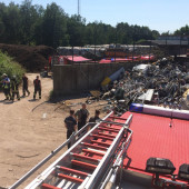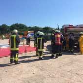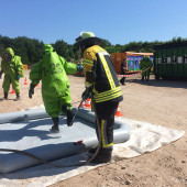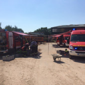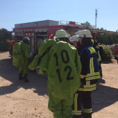 Am Sonntagmorgen wurden mehrere Einsatzkräfte des Löschzuges Gefahrgut (LZG) nach Grambek gerufen. Auf einer Mülldeponie waren zwei Mitarbeiter dabei, einen Container mit Unrat umzuladen. Dabei passierte das Unglück, der Baggerfahrer griff mit seiner Schaufel ein unentdecktes Gefahrgutfass, welches beim herausheben platzte und eine undefinierbare Flüssigkeit über beide Mitarbeiter verteilte. Sofort wurde der Rettungsdienst und LZG zur Unfallstelle alarmiert. Nachdem die ersten Einsatzkräfte eintrafen, wurde umgehend ein weiträumiger Gefahrenbereich abgesperrt. Vom Möllner Erkunder rüstete sich der erste Trupp mit einem speziellen Chemiekalienschutzanzug, dem sogenannten CSA und Messgeräten aus, um eine ausgiebige Erkundung vorzunehmen. Währenddessen bereiteten andere Kameraden an der Absperrgrenze eine Notdekontamination vor, in der die zwei Verletzten Personen mit klarem Wasser die ätzenden Flüssigkeiten abgespült bekommen. Auch jeder CSA-Trupp muss sich nach dem Einsatz an der Gefahrenstelle so einer Dekontamination stellen. Im weiteren Verlauf wurden die Flüssigkeiten in Spezialbehältern aufgefangen, um sie später an eine Fachfirma übergeben zu können. Nachdem der Gefahrenbereich durch Messgeräte frei gemessen wurde, war der Haupteinsatz für den LZG beendet.