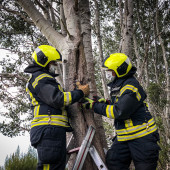 Zum ersten Einsatz im neuen Lauenburger Birnbaumkamp rückte die Feuerwehr am Mittwochabend aus. Spaziergänger entdeckten in etwa 3m Höhe in einem Baum eine offensichtlich festhängende Eule. Der Vogel konnte sich aus eigener Kraft nicht mehr aus einer Astgabel befreien. Die Alarmierte Feuerwehr rückte mit KdoW, HLF und Drehleiter an. Vor Ort erkundete Wehrführer Heuer die Lage. Mit 2 Steckleitern gingen die Einsatzkräfte zur Rettung vor. Behutsam wurde das Tier gerettet, offenbar hatte es sich beim Versuch wegzufliegen verletzt. In einer Decke geschützt und einer Tierbox verpackt wurde die Eule einem Jäger übergeben, der sich nun um den verletzten Vogel kümmert.