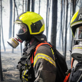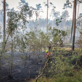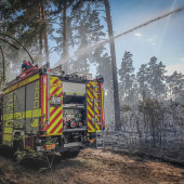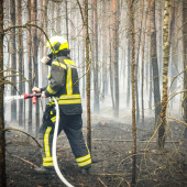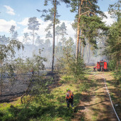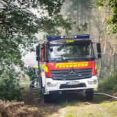 Zu einem Großeinsatz nach Mecklenburg-Vorpommern wurden die Lauenburger am Montagnachmittag alarmiert. In einem Waldgebiet unweit der Landesgrenze war ein Feuer ausgebrochen. Bereits auf der Anfahrt war die massive Rauchentwicklung zu sehen. Mit mehreren Löschfahrzeugen unterstützte die Lauenburger Wehr den Einsatz. Zunächst war unklar, wo sich das Feuer ausbreitete und wie am besten angefahren wird. Schließlich ging es in ein Waldgebiet, in welchem bereits die Partnerwehr aus Boizenburg im Einsatz war. Flammen loderten meterhoch und eine massive Rauchentwicklung erschwerte die Maßnahmen. Beim Eintreffen des Lauenburger LF 20 eilte die Besatzung dem Boizenburger TLF zur Hilfe. Die Flammen schlugen über eine Schneise, in welcher das TLF stand, in ein weiteres Waldgebiet. Höchste Gefahr für die Besatzung konnte im letzten Moment durch den Schutz des Fahrzeuges abgewandt werden. Immer wieder auffrischender Wind fachte das Bodenfeuer an. Mit dem Waldbrandkorb wurde ein Löschangriff vorgenommen, zusätzlich ging ein Trupp mit den Löschrucksäcken vor, um an der Spitze ein Ausbreiten zu verhindern. Die Maßnahmen zeigten schnell Erfolg, so dass sich die Kräfte auf die Fläche konzentrieren konnten. Die unzureichende Wasserversorgung machte den Kräften zusätzlich zu schaffen. Mit den Großfahrzeugen sowie einem Güllebehälter wurden tausende Liter Wasser aus der näheren Umgebung angefahren. Am Abend kamen zusätzliche Kräfte aus Schleswig-Holstein dazu. Die Feuerwehren Schwarzenbek und Geesthacht kamen mit zwei Löschfahrzeugen zur Unterstützung. Bis in die Abendstunden dauerte der Einsatz an.