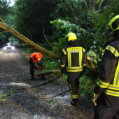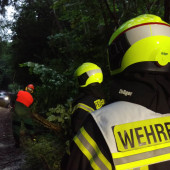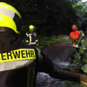 Am Samstagabend alarmierte die Leitstelle die Besatzung des HLF ein weiteres Mal. Grund war ein umgestürzter Baum, welcher die Zufahrt in ein Wohngebiet versperrte. Mit einer Motorkettensäge wurde der umgestürzte Baum zerteilt und vom Weg geräumt. Für die Sicherheit an der Einsatzstelle wurde diese mit dem Lichtmast des HLF ausgeleuchtet. Kurze Zeit später war der Weg wieder passierbar und der Einsatz für die Kräfte abgearbeitet.