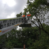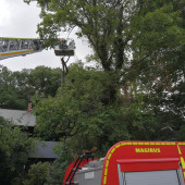 Am Mittwochabend wurde die Drehleiter der Lauenburger Feuerwehr in die Nachbargemeinde nach Geesthacht alarmiert. Dort waren bereits die Mitglieder der Wehr im Einsatz. Nach einem kurzen, aber heftigem Unwetter drohte ein größerer Ast aus einem Baum abzustürzen. Nur 3 Minuten nach dem Alarm, rückte das Hubrettungsfahrzeug aus. Gemeinsam mit der Besatzung des HLF wurde die Gefahr schnell beseitigt. Anschließend rückte die Leiter wieder zur Wache nach Lauenburg ein.