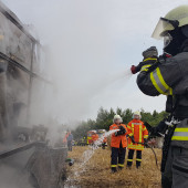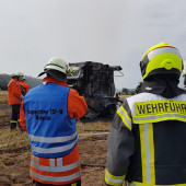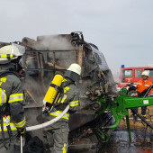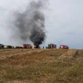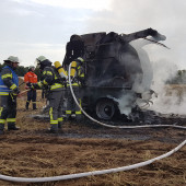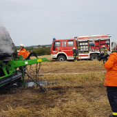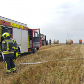 Eine brennende Rundballenpresse auf einem Stoppelfeld sorgte am Samstagnachmittag für Aufsehen nahe der Ortschaft Lütau. Schon von weitem sichtbar war die massive Rauchentwicklung, welche zahlreiche Notrufe in der zuständigen Leitstelle in Bad Oldesloe auslöste. Schnell wurden die Ortswehren aus Lütau, Basedow und Wangelau alarmiert, gleichzeitig auch die Feuerwehr Lauenburg mit wasserführenden Fahrzeugen. Da in der Feldmark kaum eine Wasserversorgung zu finden ist, fuhren aus Lauenburg Großfarhrzeuge zur Einsatzstelle raus. Beim Eintreffen von Wehrführer Lars Heuer leitete die Feuerwehr Basedow gerade die Brandbekämpfung unter Atemschutz mittels Schnellangriff ein. Das sich die Flammen auf dem trockenen Feld nicht weiter ausbreiten konnten, war auch einem ortsansässigen Landwirt zu verdanken. Geistesgegenwärtig handelte er und zog mit seinem Traktor und Gerät eine Schneise um die Maschine um ein Überspringen der Flammen auf das Stoppelfeld zu verhindern. Schnell konnte der Brand eingedämmt werden, das TLF stellte seine 2500l Wasser zur Verfügung und speiste sie in das LF10 aus Basedow ein. Die Zusammenarbeit lief hervorragend. Wenig später wurden die Lauenburger Kräfte aus dem Einsatz entlassen.