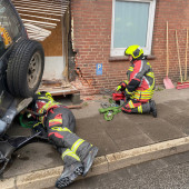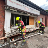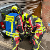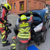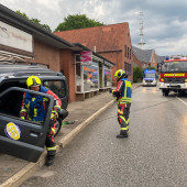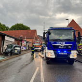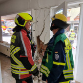 Zu einem Verkehrsunfall wurde die Feuerwehr am Mittwochnachmittag alarmiert. Gemeinsam mit einem Großaufgebot des Rettungsdienstes rückten die Kräfte an. In der Berliner Straße kam es zu einem Unfall zwischen zwei Fahrzeugen. Den Rettern bot sich zunächst eine unübersichtliche Lage. Ein verunfallter PKW stand, an der Front beschädigt an der Kreuzung zum Askanierring. Etwa 70m weiter stand ein völlig zerstörter Geländewagen in einem Ladenlokal. Einsatzleiter Lars Heuer ging sofort zur Erkundung vor. Die ersten Patienten wurden sofort von den ersten Rettungswagen betreut. Als das HLF eintraf übernahm ein Rettungssanitäter der Feuerwehr die Erstversorgung in dem 2. PKW. Wenig später traf auch das TLF an der Einsatzstelle ein. Während die Besatzung des HLF die Rettung eines Patienten aus dem PKW unterstützte und mit Planen die Blicke von Schaulisten abhielt, ging die Besatzung des TLF in das beschädigte Gebäude vor. Der Strom wurde abgestellt, das Ausmaß der Schäden überprüft. Schließlich wurde zur Beurteilung der THW Fachberater angefordert. Ein tragendes Bauteil des Gebäudes war massiv beschädigt worden. Rissen im Mauerwerk zeigten, das hier Bewegungen stattgefunden haben. Um die Statik des Gebäudes zu sichern mussten Drehsteifen und ein Verbau installiert werden. Hierzu wurde der THW OV Lauenburg angefordert. Die Helfer des THW übernahmen die Sicherungsarbeiten am Gebäude, währenddessen die Feuerwehr die Bergung des PKW vorbereitete. Nachdem die Sicherheit im Gebäude gegeben war, zog man den Wagen mittels Seilwinde aus dem Geschäft. Nach mehreren Stunden war der Einsatz beendet. Alle Kräfte rückten wieder ein. Wie es zu dem Unfall kam, ermittelt nun die Polizei.