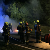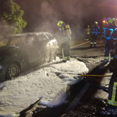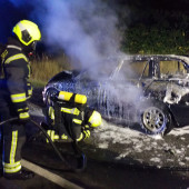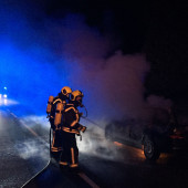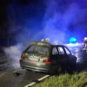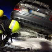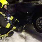 Kurze Zeit später wurde die Feuerwehr zu einem PKW-Brand alarmiert. Auch hier war die Ortsangabe sehr ungenau. Zunächst ließ die Meldung das Feuer im Stadtgebiet vermuten, später sogar in Richtung Hohnstorf. Die ausgesandten Fahrzeuge konnten jedoch kein Feuer entdecken. – Dann die Rückmeldung des LF16, „PKW im Vollbrand – B5 Höhe Horst“ funkte Fahrzeugführer Björn Krieger. Der Einsatzort lag also bereits im Nachbarbundesland Mecklenburg Vorpommern. Doch die Hilfeleistung kennt keine Grenzen. HLF und LF16 leiteten die Brandbekämpfung ein. Zunächst wurden die Flammen mit Wasser gelöscht, später Glutnester im Fahrzeuginneren mit Schaum abgelöscht. Um auch immer wieder aufflammende Betriebsstoffe unter dem Fahrzeug abzulöschen, wurde das Fahrzeug mit dem Spreizer angehoben. Auch die ortsansässige Feuerwehr Nostorf (MV) wurde durch die Leitstelle Schwerin alarmiert und übernahm die Aufräumarbeiten. Für die Zeit der Löscharbeiten war die Bundesstraße zwischen Lauenburg und Boizenburg voll gesperrt.