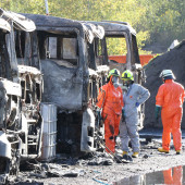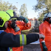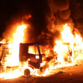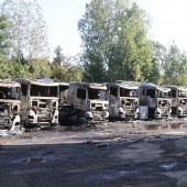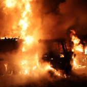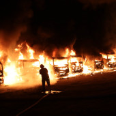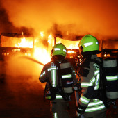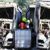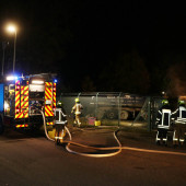 Am frühen Sonntagmorgen brannten in einem Geesthachter Gewerbegebiet mehrere LKW vollständig aus. Die Kieslaster, welche auf einem Betriebsgelände abgestellt waren gerieten aus noch ungeklärter Ursache in Brand. Mit einem Großaufgebot war die Feuerwehr Geesthacht und die FF Grünhof bis in die Morgenstunden damit beschäftigt die Flammen zu löschen. Dabei wurden mehrere Wasserwerfer eingesetzt. Später kam auch Lösschaum zum Einsatz um ein erneutes Aufflammen zu verhindern. Durch die massive Hitze war an einzelnen Fahrzeugen der Dieselkrafstofftank gerissen und ausgelaufen. Die Untere Wasserbehörde forderte Unterstützung vom Löschzug-Gefahrgut an. "Die Führungsgruppe erreichte die Einsatzstelle gegen halb 6, besprach das Vorgehen mit der Behörde sowie der Einsatzleitung" erklärt Zugführer Björn Koberstein. Die Einheiten des LZG rückten an, um Kraftstoff aus den Tanks der LKW zu pumpen. Mit einer Druckluftmembranpumpe vom Gerätewagen Gefahrgut wurden die Betriebsstoffe abgepumpt und in Spezialbehälter befördert. Dabei war wegen der eng aneinander gereihten LKW kein Platz für große Gerätschaften. Die Druckluft betriebene Pumpe ist "Ex" geschützt, das bedeutet, das sie auch in explosionsfähiger Atmosphäre betrieben werden kann. 5.000l Hydrauliköl und Krafstoff wurden schließlich in großen Behältern gesichert. Gemeinsam mit der Feuerwehr Geesthacht war der Einsatz gegen 12 Uhr beendet.