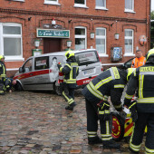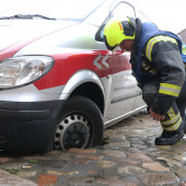 Noch während die Maßnahmen im Bereich des Hafenbeckens liefen wurde die Feuerwehr über einen weiteren Einsatz informiert. In der Bahnhofstraße war ein Transporter in der Kopfsteinpflasterstraße eingebrochen und eingesackt. Sofort wurde die Einsatzstelle abgesichert. Gemeinsam mit Mitarbeiern der Versorgungsbetrieben suchte der Fahrzeugführer nach möglichen Auslösern für den Vorfall. Nachdem die Bergung des Fahrzeuges abgeschlossen war, wurde die Einsatzstelle an die Polizei und die Versorgungsbetriebe übergeben.