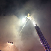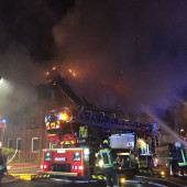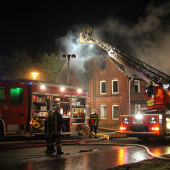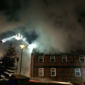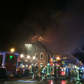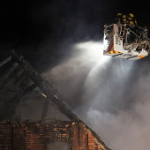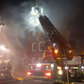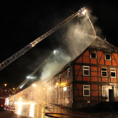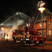 Unter dem Stichwort Feuer Groß wurde in der Nacht zu Montag die Feuerwehr Lauenburg nach Boizenburg alarmiert. Vor Ort waren bereits die örtliche Feuerwehr sowie die Freiwilligen Feuerwehren der umliegenden Gemeinden im Einsatz. Beim Eintreffen der ersten Kräfte stand das leer stehende Gebäuden schon im Vollbrand. Meterhoch schlugen die Flammen aus dem Dachstuhl. Aufgrund des starken Funkenfluges und der Größe des Gebäudes alarmierte der Boizenburger Einsatzleiter die Drehleiter aus Lauenburg nach. Innerhalb kürzester Zeit rückten die Kräfte mit dem KdoW, der Drehleiter sowie dem LF16, welches immer als Ergänzungskomponente mit der DLAK ausrückt, aus.