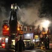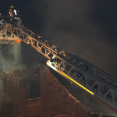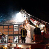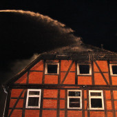 Beim Eintreffen der Drehleiter konnte Wehrführer Heuer bereits eine geeignete Aufstellfläche ausweisen. Für die Brandbekämpfung rüstete sich ein Atemschutzträger von der Leiter aus, Maschinist und Fahrzeugführer bereiteten das Fahrzeug für den Löschangriff vor. Durch das Boizenburger HLF wurde der große Wasserwerfer, der direkt im Korb installiert ist, gespeist. Mehrere tausend Liter Wasser wurden über dem Objekt ausgebracht. Auch die Drehleiter aus Boizenburg war an der gegenüber liegenden Hausecke in Stellung und löschte von dort aus die Flammen.