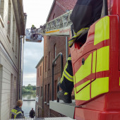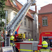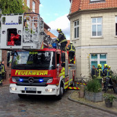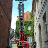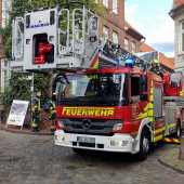 Am Mittwochnachmittag alarmierte die Rettungsleitstelle die Feuerwehr in die Lauenburger Altstadt. Passanten wurden auf einen piependen Rauchmelder aufmerksam und alarmierten die Rettungskräfte. Kurze Zeit später rückte Wehrführer Heuer mit seiner Mannschaft an. Das Piepen kam vermutlich aus einer Wohnung im Dachgeschoss, erlosch jedoch mit dem Eintreffen der Kräfte. Um die Wohnung dennoch zu kontrollieren, wurde die angerückte Drehleiter zwischen der engen Altstadt Bebauung in Stellung gebracht. Dank bester Ausbildung wurde der beengte Platz optimal genutzt und die Aufstellung gewählt. Diverse Hindernisse schränkten die Aufstellmöglichkeiten ein. Dennoch gelang es der Besatzung durch die Fenster im Obergeschoss in die Wohnung zu blicken. Kurze Zeit später konnte Wehrführer Heuer über den nun etablierten Digitalfunk die Rückmeldung „defekter Heimmelder gab Anlass zur Alarmierung“ geben. Die Kräfte rückten kurze Zeit später wieder ein.