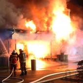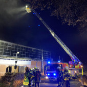 Am späten Freitagabend kam es in Büchen im Foyer der Schulsporthalle zu einem Großfeuer. Bereits beim Eintreffen der Büchener Feuerwehr stand der Vorderbau der Turnhalle fast in Vollbrand, worauf der Einsatzleiter vor Ort gleich weitere Kräfte nachforderte, unter anderem auch die Schwarzenbeker Drehleiter, die beim Eintreffen zur Brandbekämpfung und Riegelstellung im vorderen Bereich eingesetzt wurde. Da sich das Feuer bereits auf den ersten Bereich der Turnhalle ausgebreitet hatte, war in den ersten Minuten nicht auszuschließen, dass es sich auf die komplette Sporthalle ausbreiten könnte. In diesem Zuge wurde die Feuerwehr Lauenburg kurz nach elf als zweite Drehleiter angefordert. Mit DLAK, LF20 und Kdow rückten die Kräfte kurz nach dem Alarm Richtung Büchen aus. Am Einsatzort angekommen ging die Lauenburger Drehleiter an der Längsseite der Halle in Stellung - vorbereitet komplett zur Brandbekämpfung, um bei einer Ausbreitung des Feuers eingreifen zu können. Nebenbei wurde im oberen Bereich ein Fenster eingeschlagen, um eine Abluftöffnung zu schaffen. Nachdem das Feuer einige Zeit später soweit unter Kontrolle war, konnten die Lauenburger Kräfte nach ca. 2 1/2 Stunden die Einsatzstelle verlassen. Für die anderen Einsatzkräfte zog sich der Einsatz noch bis spät in die Nacht hinein.