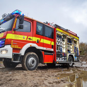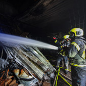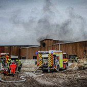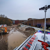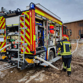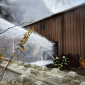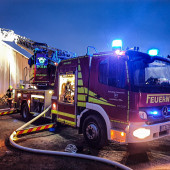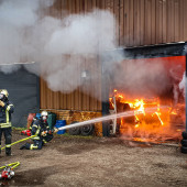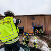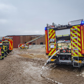 Ein Feuer in einem Buchhorster Gewerbebetrieb sorgte am Dienstagnachmittag für einen Großeinsatz von Feuerwehren. Gegen 13:38 Uhr alarmierte die Leitstelle die Feuerwehren aus Buchhorst und Lauenburg. Ersten Angaben zufolge war es in einem Teil der Halle zur eine Brandausbruch gekommen. Neben zahlreichen Fahrzeugen wird auch Kraftstoff und Wertstoffe in dem riesigen Gebäude gelagert. Nach kurzer Zeit war das LF 16 der Buchhorster Feuerwehr vor Ort, wenig später traf das LF 20 der Lauenburger Wehr ein. Meter hohe Flammen schlugen aus einem offenen Tor empor. – Das Einsatzstichwort wurde auf FEU 2 erhöht und damit die Feuerwehr Schnakenbek zusätzlich alarmiert. Ein Angriffstrupp hatte bereits die Brandbekämpfung mit einem C-Rohr eingeleitet. – Schnell wurde entschlossen, den Wasserwerfer des LF 20 in Betrieb zu nehmen. Mit 1600l / Minute und beigemengtem Schaummittel waren die großen Flammen innerhalb von Sekunden gelöscht. Gezielt konnte jetzt der erste Angriffstrupp gegen die Flammen vorgehen. Einsatzleiter Florian Lüttge erkundete die Lage rund um das riesige Gebäude und bildete gemeinsam mit Lauenburgs Wehrführer Lars Heuer Brandabschnitte. Weitere eintreffende Fahrzeuge wurden an strategisch wichtigen Punkten aufgestellt und übernahmen Löscharbeiten. Das Feuer hatte sich auch in der Dachkonstruktion ausgebreitet. Um genügend Atemschutzgeräteträger zur Verfügung zu haben, wurde auch die Feuerwehr Hohnstorf aus Niedersachsen angefordert, währenddessen wurde auch das Alarmstichwort noch einmal auf FEU 3 erhöht. Über mehrere Stunden war die Feuerwehr mit den Löscharbeiten beschäftigt. Über die Drehleiter mussten Teile der Dachhaut geöffnet werden damit Glutnester abgelöscht werden konnten. Bis in die Abendstunden waren die Kräfte im Einsatz. Auch in der Nacht kam die Feuerwehr erneut zur Brandwache, hierbei unterstützte auch die Lauenburger Drehleiter.