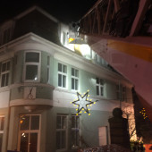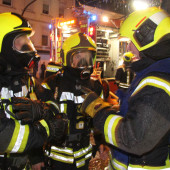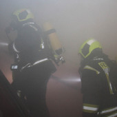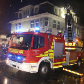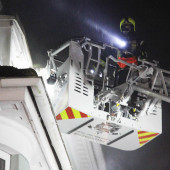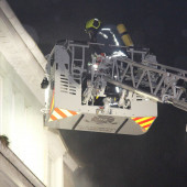Als das Hilfeleistungslöschfahrzeug (HLF) eintraf, stand somit primär die Menschenrettung im Vordergrund. Sofort ging ein Trupp unter Atemschutz und mit C-Rohr ins Gebäude zur Suche der Vermissten vor. Die zeitgleich eintreffende Drehleiter (DLK) wurde schnell in Stellung gebracht, um die am Fenster im Rauch stehende Person zu retten. Zügig war ein Feuerwehrmann mit dem Rettungskorb der DLK in Fensternähe und brachte die Person aus dem Gefahrenbereich. Kurze Zeit später hatte diese schon wieder festen Boden untern den Füßen und konnte medizinisch versorgt werden. Danach wurde die Drehleiter wieder zur Anleiterbereitschaft und Sicherheit der im Gebäude befindlichen Einsatzkräfte aufgerichtet und in der Nähe vom Fenster abgestellt.