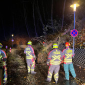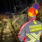 Kurz nachdem die Einsatzkräfte wieder eingerückt waren rief die Leitstelle die Mitglieder der Lauenburger Feuerwehr erneut zum Einsatz. In der Straße Großer Sandberg war ein größerer Baum am Hang umgekippt und auf die Straße geschlagen. Eine Durchfahrt war nicht mehr möglich. Mit Motorkettensägen und Muskelkraft wurde das Hindernis beseitigt. Dies sollte der letzte Einsatz sein, den Sturmtief Daniel uns beschert hat.