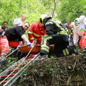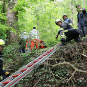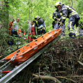 Am Samstagmittag wurde der Hilfeleistungszug sowie ein Aufgebot des Rettungdienstes nach Lauenburg alarmiert. Ersten Angaben zufolge sollte eine Person ab Steilhang zwischen Lauenburg und Schnakenbek abgerutscht und hinabgestürzt sein. Der genaue Einsatzort war zunächst unklar. Die Einsatzfahrzeuge verteilten sich entlang des Wanderweges, einzelne Trupps machten sich auf um den Verunglückten zu finden. Schließlich hatte die Besatzung des LF16 Erfolg. Unweit einer befahrbaren Straße wurde die Person aufgefunden. Gemeinsam mit dem Rettungsdienst wurde die Versorgung des Patienten aufgenommen. – Für die Rettung aus dem unwegsamen Gelände am Elbhang wurde die Rettung über eine schiefe Ebene vorbereitet. Offenbar war der verunfallte am Steilhang rund 25m abgestürzt. Für die weitere Versorgung wurde er mit dem Rettungswagen ins Krankenhaus transportiert. Nachdem alle Ausrüstungsgegenstände wieder verlastet waren, rückte auch die Feuerwehr wieder ein.