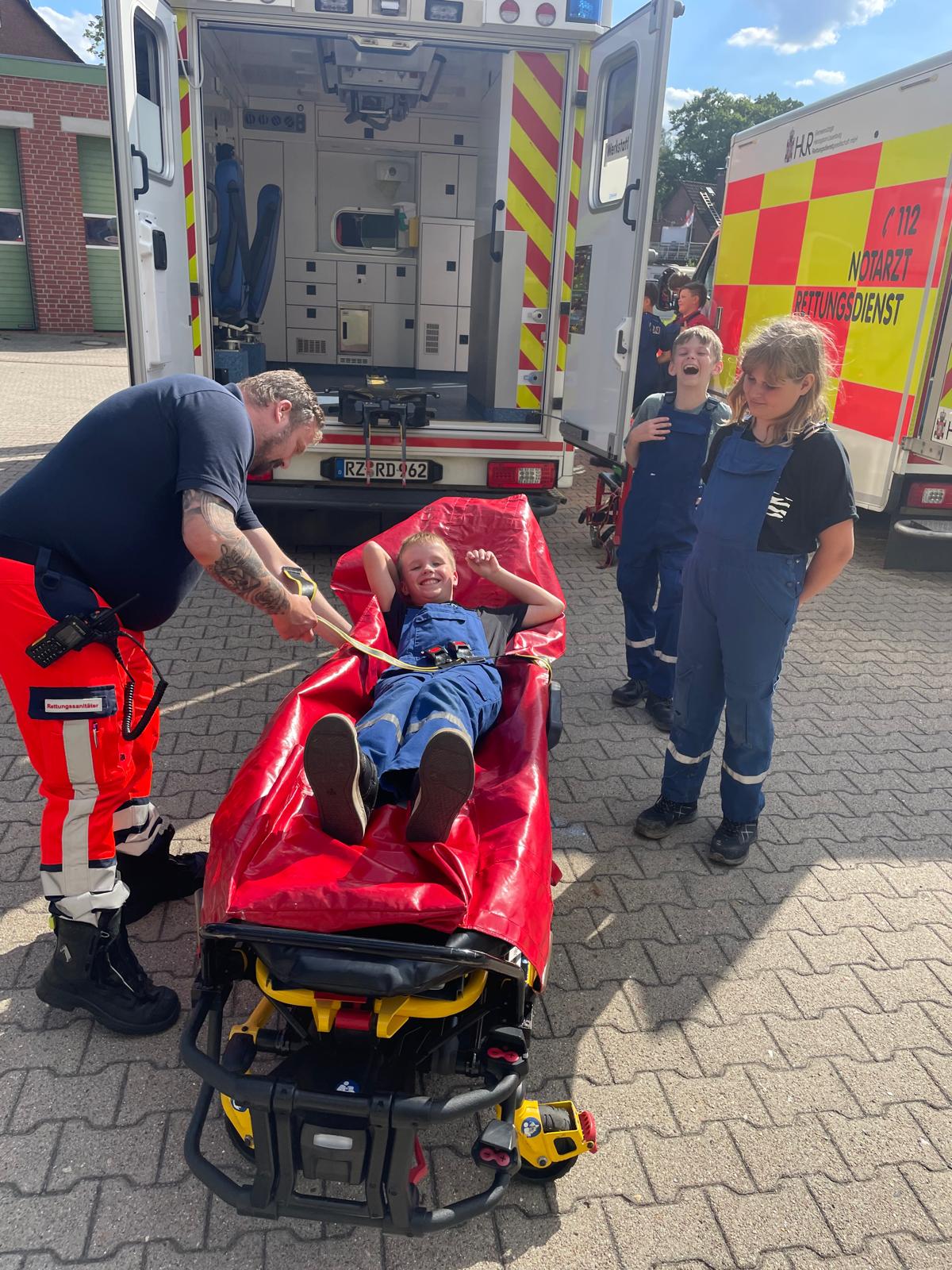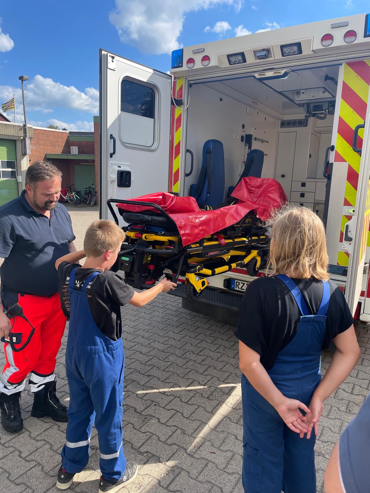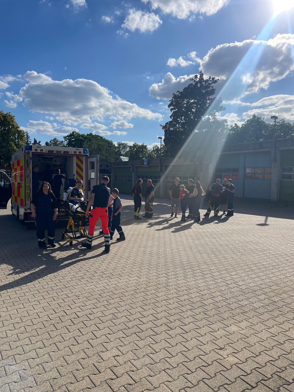 Im Normalfall werden die Dienste von unseren Gruppenführern ausgearbeitet. Dort werden dann zum Beispiel der Löschangriff, die Leitern der Feuerwehr oder die Knoten, die bei der Feuerwehr benötigt werden, geübt. Den letzten Dienst im Monat planen jedoch immer unsere Ausbilder. Diesmal haben sie sich was ganz Besonderes überlegt. Wir hatten einen Rettungswagen des HLR bei uns an der Feuerwehrwache zu Besuch und durften diesen ganz genau unter die Lupe nehmen. Am Anfang des Dienstes waren sogar zwei RTW´s der Lauenburger Rettungswache bei uns. Einer wurde jedoch nach kurzer Zeit zu einem Notfall in Lauenburg gerufen. Nach anfänglicher Zurückhaltung, gingen wir auf Erkundungstour und haben uns angeschaut, was wir alles für spannende medizinische Gerätschaften im RTW finden, die man bei einem medizinischen Notfall benötigt. Nicht selten kommt es vor, dass Rettungsdienst und Feuerwehr bei einem Einsatz Hand in Hand zusammenarbeiten. Daher ist es gut zu wissen, wie einige der Sachen auf dem Rettungswagen funktionieren. Ebenfalls wurde uns gezeigt, wie man die Patiententrage aus dem Rettungswagen holt. Die Jugendlichen, die wollten, durften sich auch einmal auf die Trage legen und schauen, wie sich das so anfühlt. Nachdem wir all unsere Fragen los werden konnten und diese geduldig von den Mitarbeitern des HLR beantwortet wurden, war unser Dienst auch schon wieder vorbei. Wir bedanken uns sehr beim HLR für den Besuch bei uns. Wir haben sehr viel gelernt und es hat uns riesig viel Spaß gemacht.