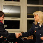 Im Anschluss war es Zeit, Abschied zu nehmen. Bendix Bollhorn und Tom Rathje waren seit ihrem 10. Lebensjahr Mitglied der Jugendfeuerwehr. In zahlreichen Diensten erlangten die beiden Wissen über die Arbeit der Feuerwehr, wurden durch die Ausbilder auf ihre Kariere in der aktiven Wehr vorbereitet. In ihrer Laufbahn bewältigten beide mehrere Prüfungen, so haben beide die Jugendflamme 2 sowie die Leistungsspange der Jugendfeuerwehren. Beide unterstützten die Feuerwehr bei der Elbeflut 2013 und wurden dafür durch das Land mit einer Ehrenmedaille ausgezeichnet. Nun übergab Jugendwartin Gabi Fischer die Beiden in die Hände von Gemeindewehrführer Lars Heuer. Dieser freut sich über den motivierten und bestens ausgebildeten Nachwuchs, schon nächste Woche werden beide bei der Jahreshauptversammlung der aktiven Wehr offiziell übernommen.