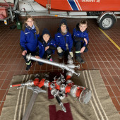 Die Aufgaben waren: Eine Murmel durch einen Feuerwehrschlauch führen, eine Decke umzudrehen, ohne das jemand den Boden berührt und aus Feuerwehrgerätschaften ein Monster bauen. Die Kunstwerke können Sie hier unten bewundern.