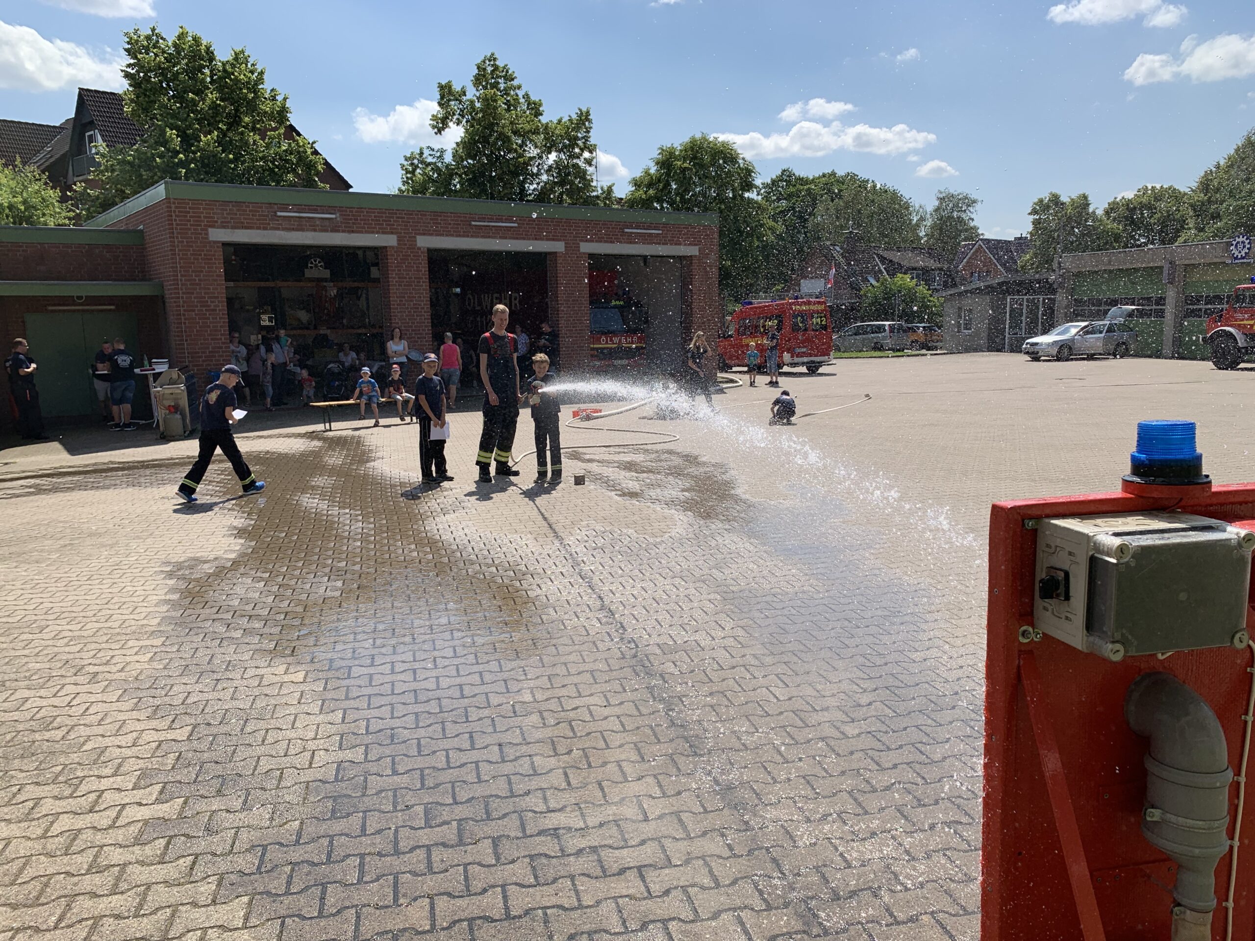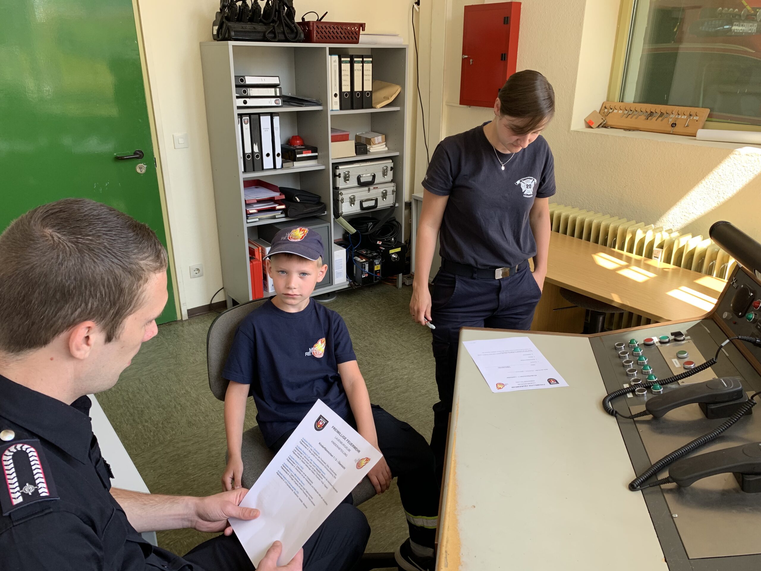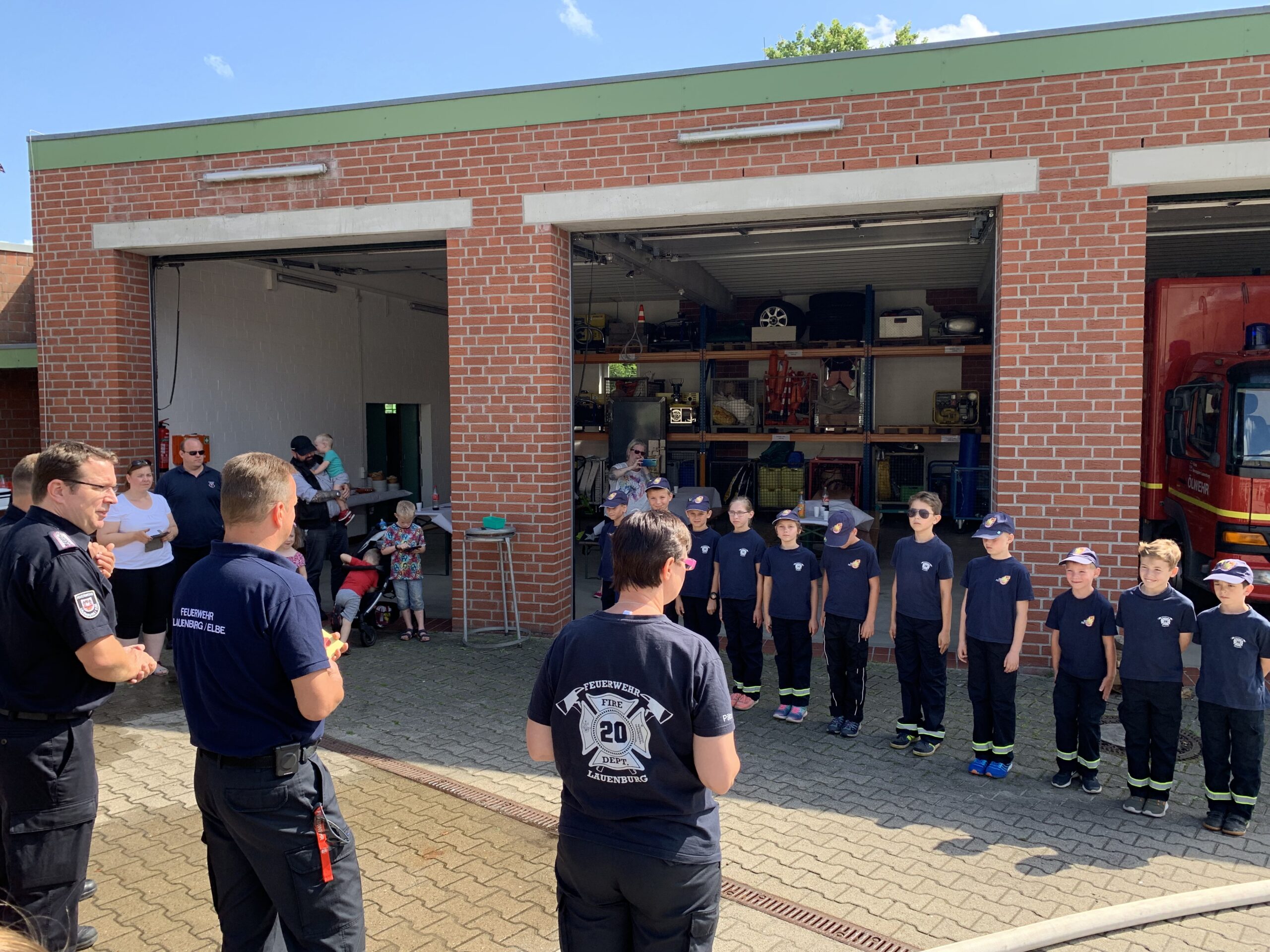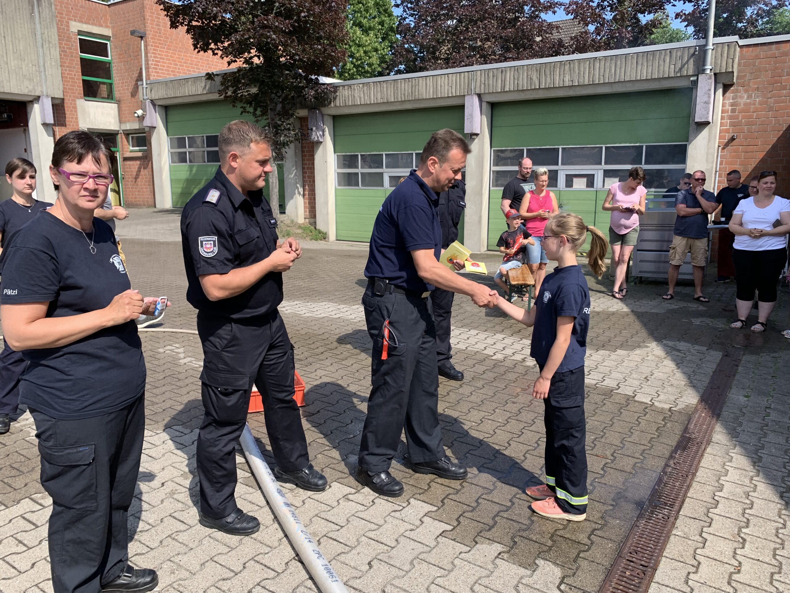 Am 22.06.2019 war es wieder einmal so weit. Die Abnahme des Kindesflämmchens stand an. Einmal im Jahr legen die Kinder der Mini-Retter eine Prüfung ab, in der das zuvor gewonnene Wissen abgefragt wird. Um 15:00 Uhr hieß es Antreten. Jeder bekam seine Laufkarte und machte sich auf zu den Stationen. An der ersten Station mussten die Komponenten der persönliche Schutzkleidung und die „Fünf W’s“ genannt werden. Bei der zweiten Station ging es um das Thema Feuer. Wie zünde ich eine Kerze sicher mit Streichhölzern oder einem Feuerzeug an? Unter Aufsicht musste jeder dann einmal eine Kerze mit einem Feuerzeug anzünden. Bei der dritten Station kam die Erste Hilfe auf den Prüfstand. Es galt eine Betreuerin in die stabile Seitenlage zu bringen. Die Station vier war wohl am interessantesten. Zuerst musste ein D-Schlauch ausgerollt werden, dann ein Strahlrohr angeschlossen und zu guter letzt auf die Spritzwand gespritzt werden. Bei der letzten Station ging es um Feuerwehrarmaturen. Verschiedene Teile, wie Standrohr oder Verteiler mussten im Fahrzeug gezeigt und erklärt werden. Voller Anspannung gaben die Prüflinge ihre Laufkarten ab. Die Prüfungskommission zog sich zurück, um das Ergebnis auszuwerten. Wenig später verkündete Gemeindewehrführer Lars Heuer das Ergebnis. ALLE HABEN BESTANDEN! Die große Freude stand allen Kindern ins Gesicht geschrieben. Lars überreichte zusammen mit Anja Pätzold und Dennis Lühr die neuen Flämmchenstecker. Zusammen mit den Eltern und Geschwistern klang der Abend bei Grillgut und Salaten aus.