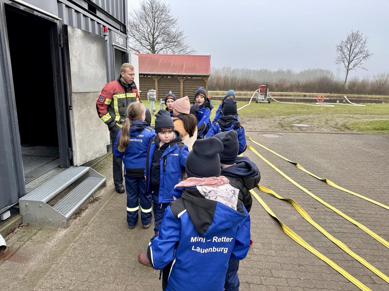 Während des heutigen Dienstes, hatten die Mini-Retter die Möglichkeit sich die feuerwehrtechnische Zentrale (FTZ) in Elmenhorst zu besichtigen. Hier findet die Ausbildung aller Feuerwehrangehörigen aus dem Kreis Herzogtum Lauenburg statt. Des Weiteren hat hier die Geschäftsstelle und die Schirmmeisterei, die für die Wartung und Prüfung der Feuerwehrausrüstung zuständig ist, ihren Sitz. Los ging die Führung mit dem Hauptgebäude. Hier befindet sich die Kantine, ein Teil der Lehrsäle, die Zimmer der Geschäftsstelle und die einzelnen Büros der Fachbereiche. Angegliedert an das Hauptgebäude sind zwei Fahrzeughalle, in denen die Einsatzmittel des LZ-G, des Katastrophenzuges, der technischen Einsatzleitung und die Ausbildungsfahrzeuge stehen. Fahrzeug für Fahrzeug wurde besprochen und erklärt, wofür dieses eingesetzt wird. Bei den Fahrzeugen handelt es sich nämlich um Spezialfahrzeuge, die extra für die Sonderzüge des Kreises konzipiert worden sind. Natürlich durfte sich auch jeder, der wollte, in die verschiedenen Fahrzeuge reinsetzen. Weiter ging’s mit der Erkundung der Außenanlage. Hier sind vor allem verschiedene Einsatzszenarien für die Ausbildung aufgebaut. Von Verkehrsunfälle zu Gruben bis hin zu zwei großen Bahnwagons hat die Anlage einiges zu bieten. Als nächstes ging es in die Schirmmeisterei. Hier werden die Feuerwehrfahrzeuge von allen Feuerwehren aus dem Kreis Herzogtum Lauenburg einmal im Jahr geprüft und gewartet. Dafür gibt es eine große Werkstatt. Des Weiteren kümmert sich die Schirmmeisterei um die Reinigung der Schläuche und der Atemschutzgeräte. Von dort aus ging es in den Atemschutzausbildungsbereich. Hier befindet sich eine Belastungsstrecke für die aktiven und zukünftigen Geräteträger. Zu dieser Strecke gehört unter anderem eine große Labyrinthstrecke. Diese durften die Kinder auch selbst ausprobieren und durchkrabbeln. Nachdem alle Kinder einmal durch waren, konnte noch der neue Brandübungscontainer bestaunt werden. Dabei handelt es sich um einen großen 40 Fuß Container, in dem verschiedene gasbefeuerte Brandstellen verbaut sind. Hier können die Feuerwehrleute das Vorgehen in einem Brandeinsatz üben.