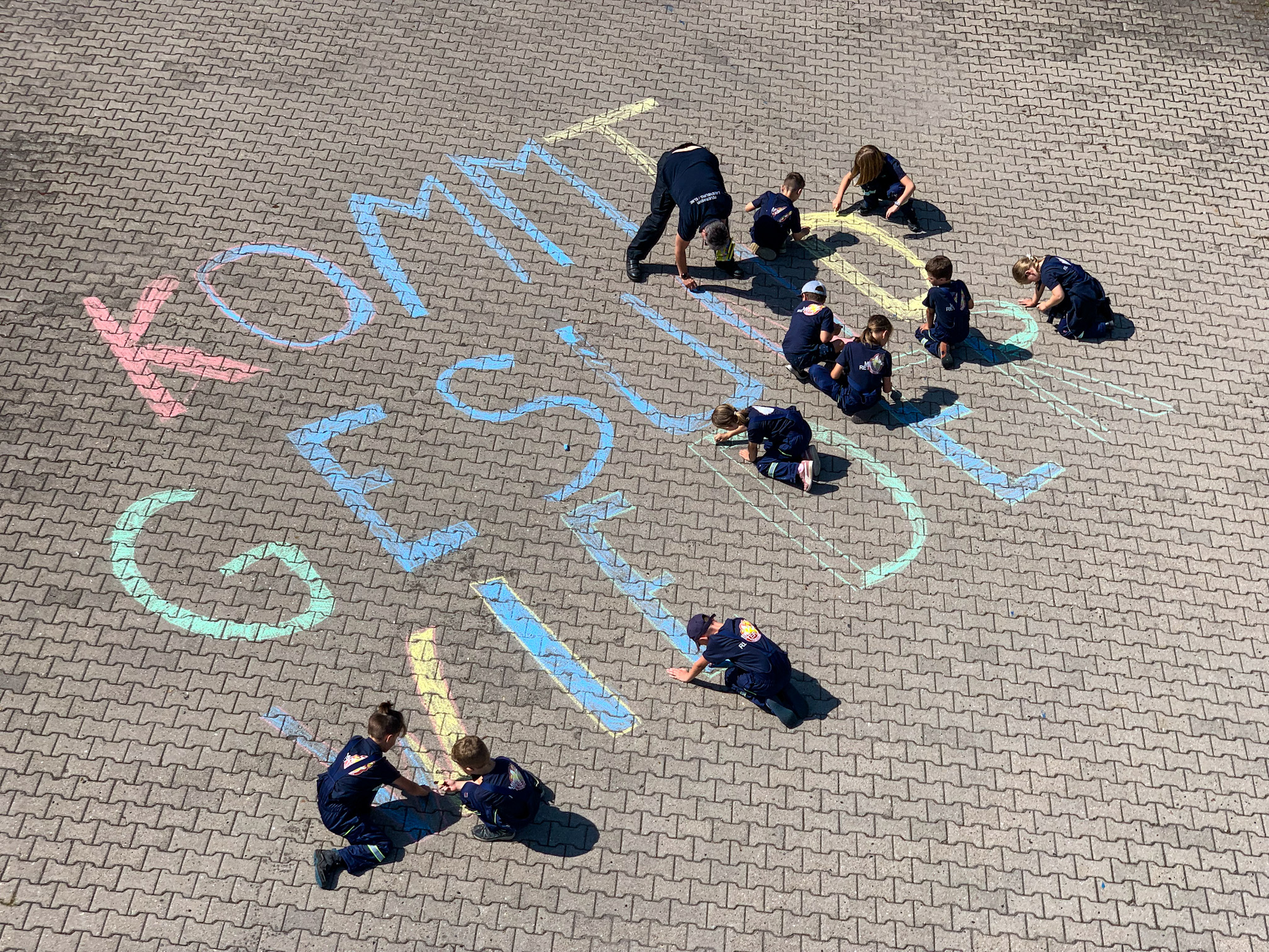 Aufgrund der weiter angespannten Situation in Rheinland-Pfalz fährt heute Abend eine Gruppe der Feuerwehr Lauenburg zusammen mit weiteren Kräften des Kreises ins Krisengebiet, um die dort im Einsatz befindenden Kräfte abzulösen. Aus diesem Grund hatte sich die Leitung der Mini-Retter eine besondere Überraschung überlegt. In großen Buchstaben sollte die Botschaft “Kommt gesund wieder” für die Kameraden auf dem Innenhof der Feuerwache stehen. Zusammen mit den Kindern wurde die Nachricht mit Kreide auf die Ausfahrt der Wache geschrieben. Wir wünschen den Kameraden viel Glück für den Einsatz im Krisengebiet und kommt bitte alle gesund wieder vom Einsatz zurück nach Hause.