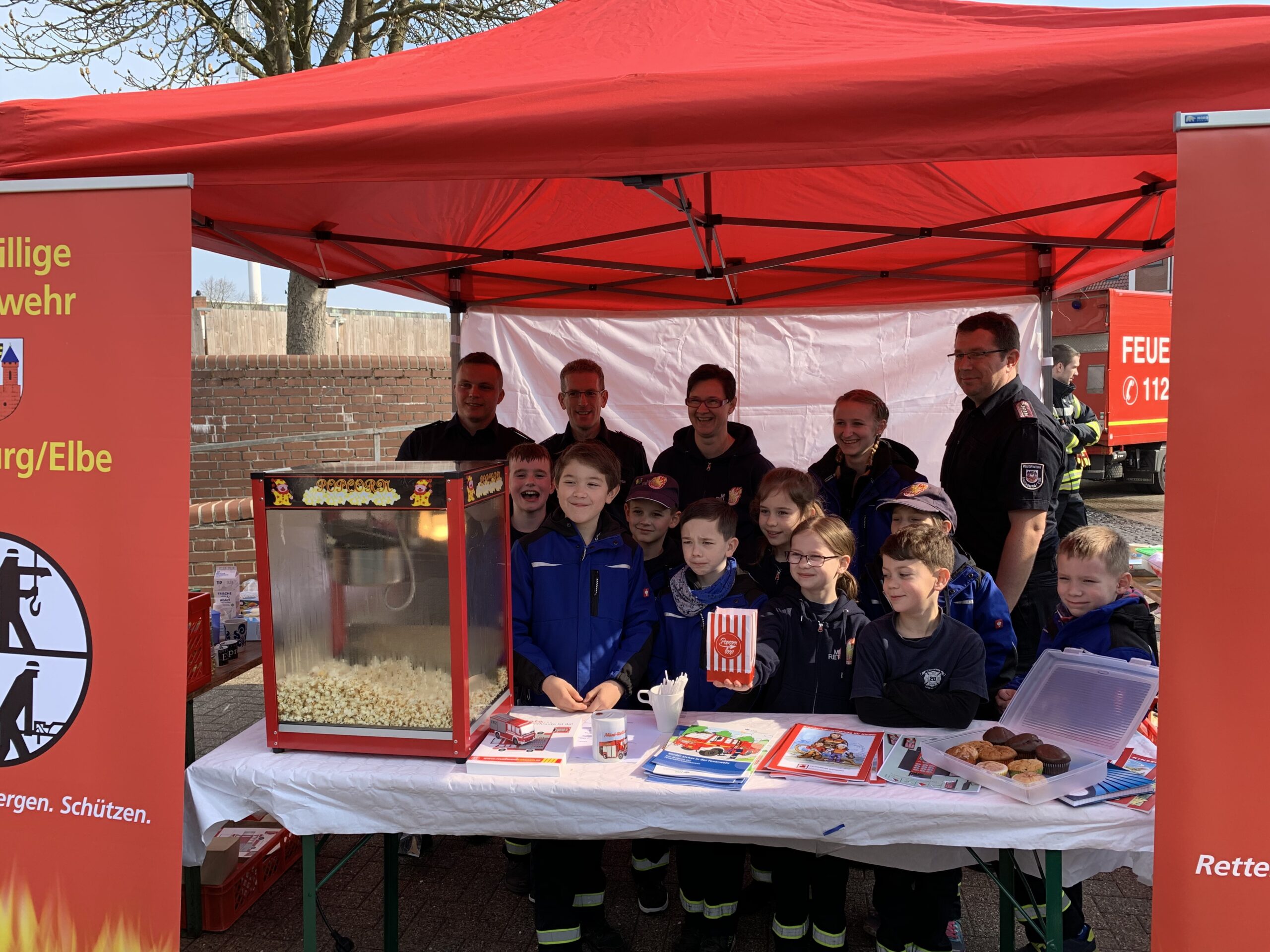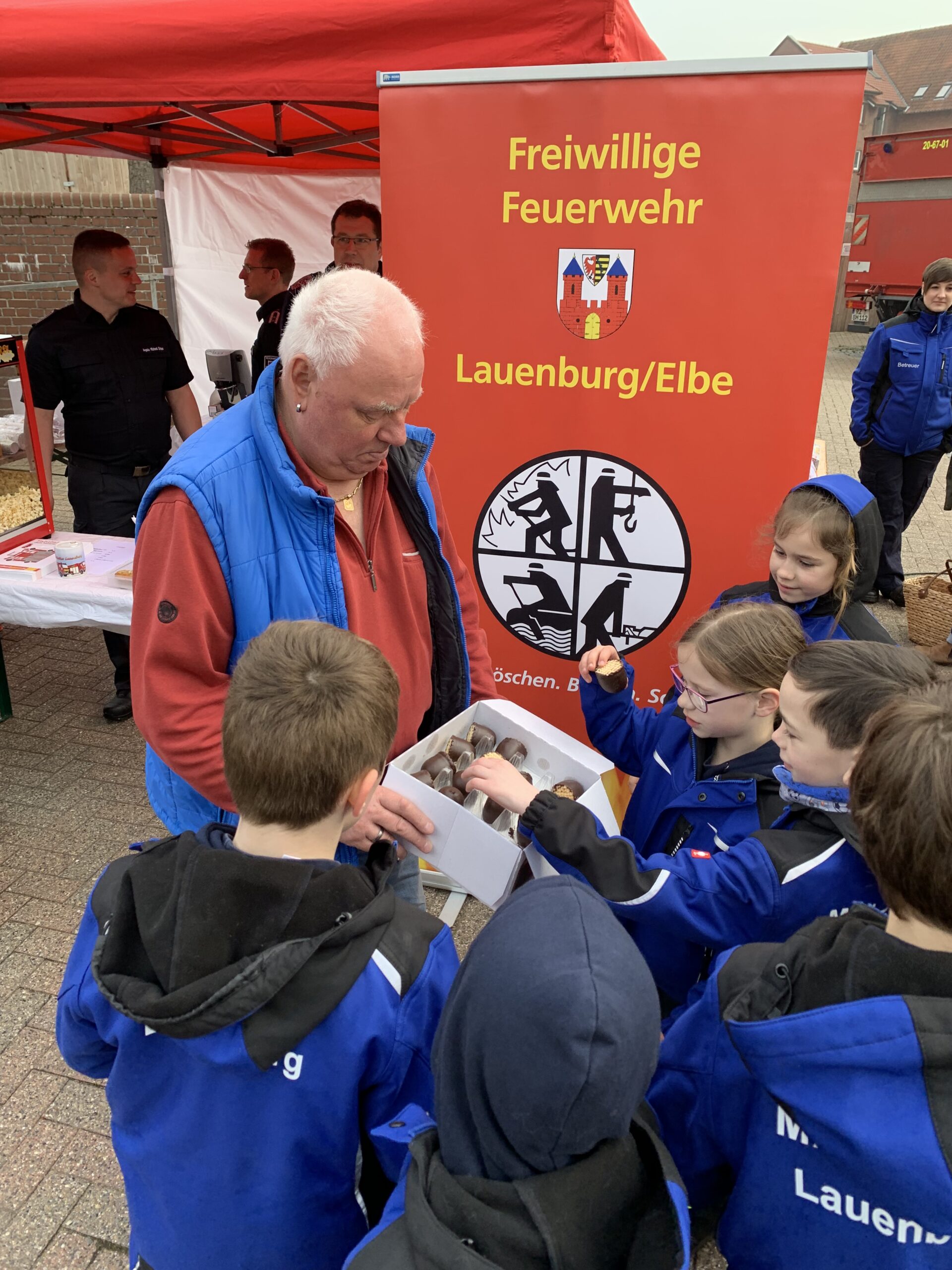 An diesem Samstag stand der Lauenburger Wochenmarkt unter einem besonderen Motto: Frühjahrserwachen auf dem Wochenmarkt. Beim Kauf von Ware bekam man ein Los und konnte mit etwas Glück kleine Präsente gewinnen, die von den Markthändlern ausgegeben wurden. Auch die Mini-Retter haben sich mit einem Stand präsentiert. Es wurden selbstgemachte Muffins, Waffeln und Popcorn angeboten. Aber auch verschiedene Kaffeekreationen konnten erstanden werden. Einige der Kinder sind über den Marktplatz gegangen und haben fleißig die Werbetrommel gerührt. Vorbeikommende Kinder konnten ihr Können an der Feuerlöschwand unter Beweis stellen oder ein Feuerwehrauto basteln. Außerdem lagen verschiedene Informationsmaterialien aus zum Thema Brandschutzerziehung. Aus unserer Sicht war es eine gelungene Veranstaltung.