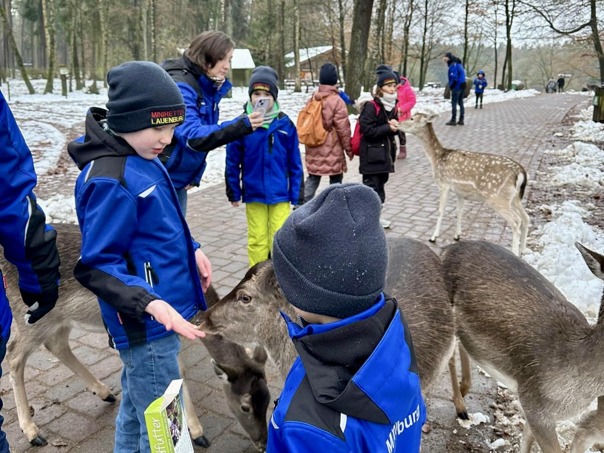 Das Jahr 2023 neigt sich schon wieder dem Ende. Auch die Mini-Retter hatten heute ihren letzten Dienst in diesem Jahr. Dieses Ma ging es in den Wildpark Schwarze Berge. Dort war eine geführte Tour durch den Park geplant. Vor Ort wurden wir von einer Mitarbeiterin in Empfang genommen. Und dann konnte das Abenteuer auch schon los gehen. Es ging von Tiergehege zu Tiergehege. Überall blieben wir kurz stehen und die Mitarbeiterin erzählte uns ein paar spannende Fakten über die jeweilige Art. Aber auch unser eigenes Wissen konnten wir in die Tour mit einbringen. Weil wir ja nun in Begleitung durch den Park gingen, war es möglich bei vielen Tieren ins Gehege zu gehen und diese Hautnah erleben zu können. Vielen durften die Kinder streicheln und auch füttern. Eine Stärkung zwischendurch durfte natürlich auch nicht fehlen. So konnten wir uns bei Nuggets und Pommes Frites stärken. Und so ging ein spannender Ausflug zu Ende. Die Mini-Retter haben viele verschiedene Tierarten gesehen und das ein oder andere neue Wissen erlernt.