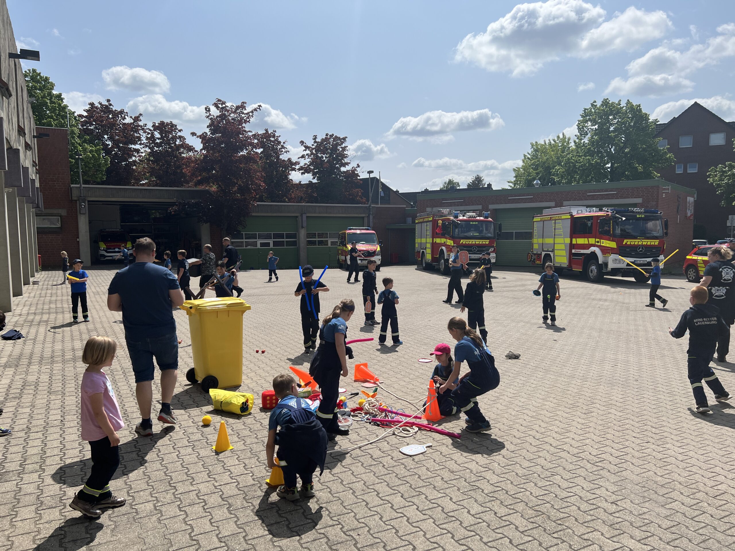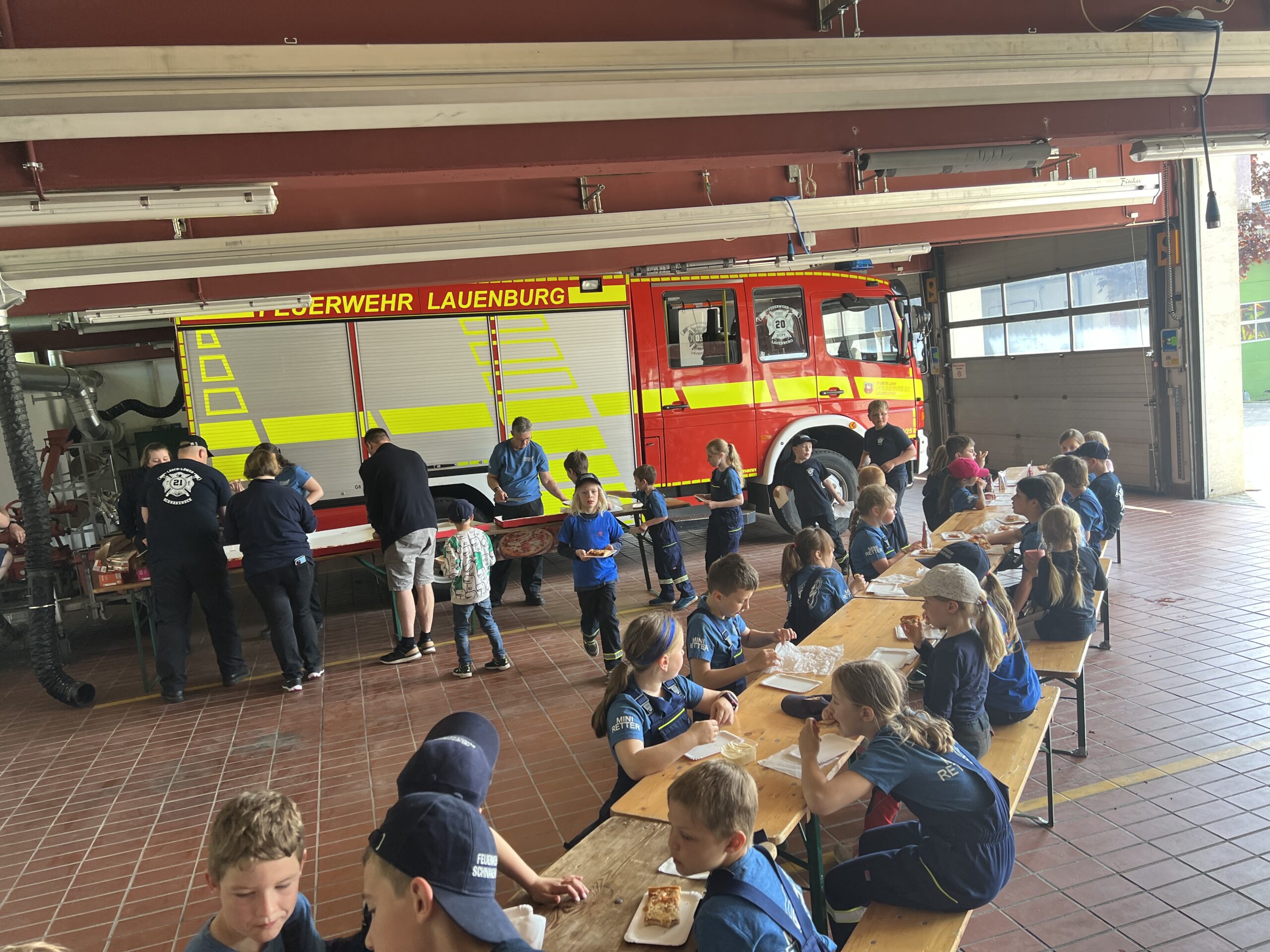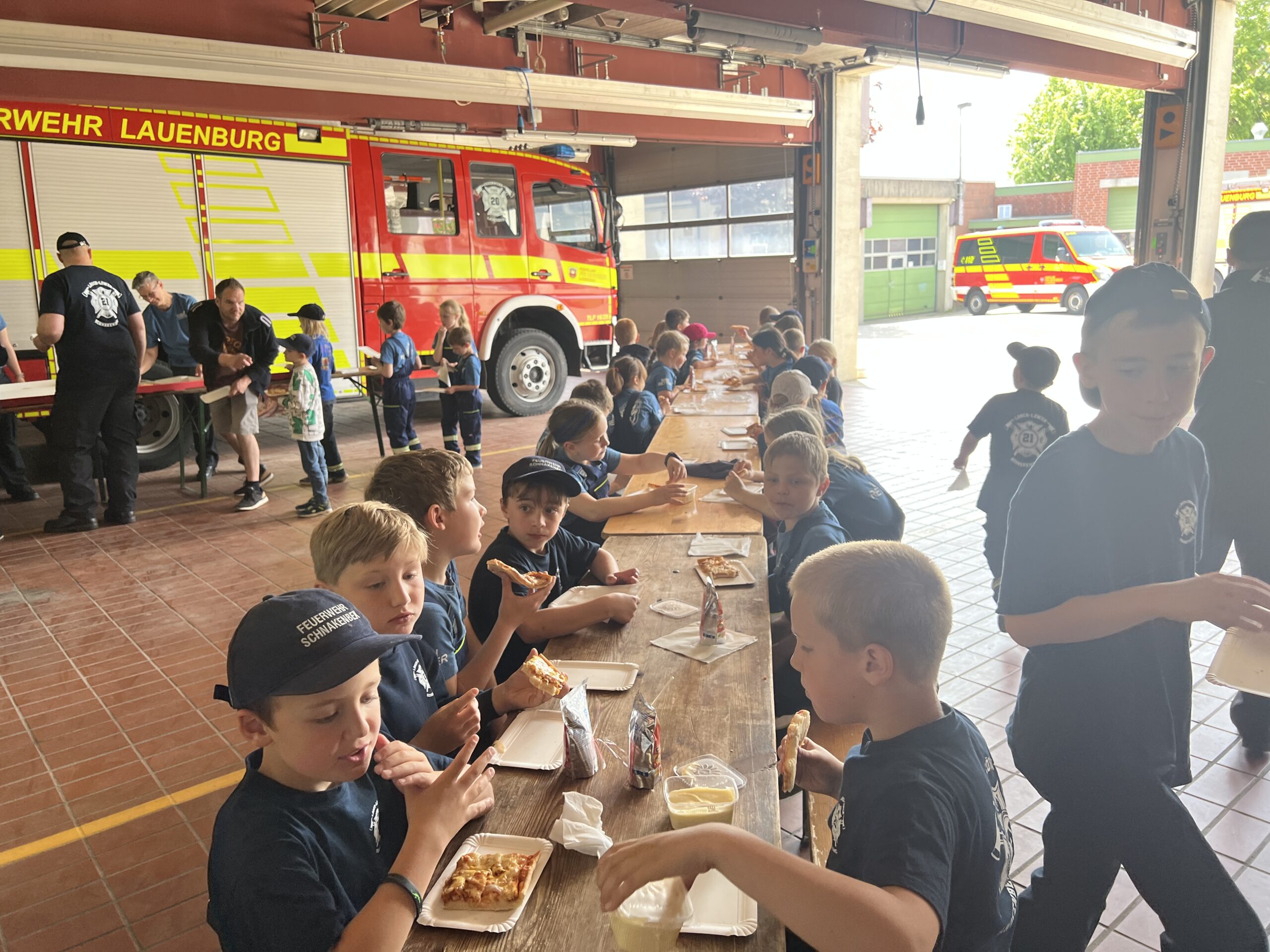 Bei herrlichem Sonnenschein fand der erste gemeinsame Dienst der Kinderfeuerwehren aus Lauenburg und Schnakenbek statt. Um 11 Uhr ließ Anja Pätzold alle Kinder antreten. Ein Buntes Programm wurde von den Betreuern ausgearbeitet. Es gab unterschiedliche Stationen, an denen Aufgaben als Team abgearbeitet werden mussten. Drei gemischte Gruppen wurden gebildet und dann ging es auch schon los. Unter anderem mussten die Kinder Wasser von Eimer zu Eimer transportieren. Dabei mussten sie von ausgelegten Papptellern balancieren. Bei der Schnelligkeitsübung musste ein Strahlrohr möglichst schnell von der einen Seite des Schlauches zu anderen gebracht und angekuppelt werden. Zwischen den ganzen Spielen wurden immer wieder Trinkpausen eingelegt. Nachdem alle Gruppen jede Station einmal ausprobiert hatte, konnte die Kinder noch ein wenig sich selbst zusammen beschäftigen. Dafür wurde extra eine Spieletonne vom Kreisfeuerwehrverband organisiert, wo viele verschiedenste Bälle und andere Spielmöglichkeiten drin waren. Aber auch eine kleine Stärkung durfte nicht fehlen. Deshalb wurde zum Abschluss noch gemeinsam Pizza gegessen.