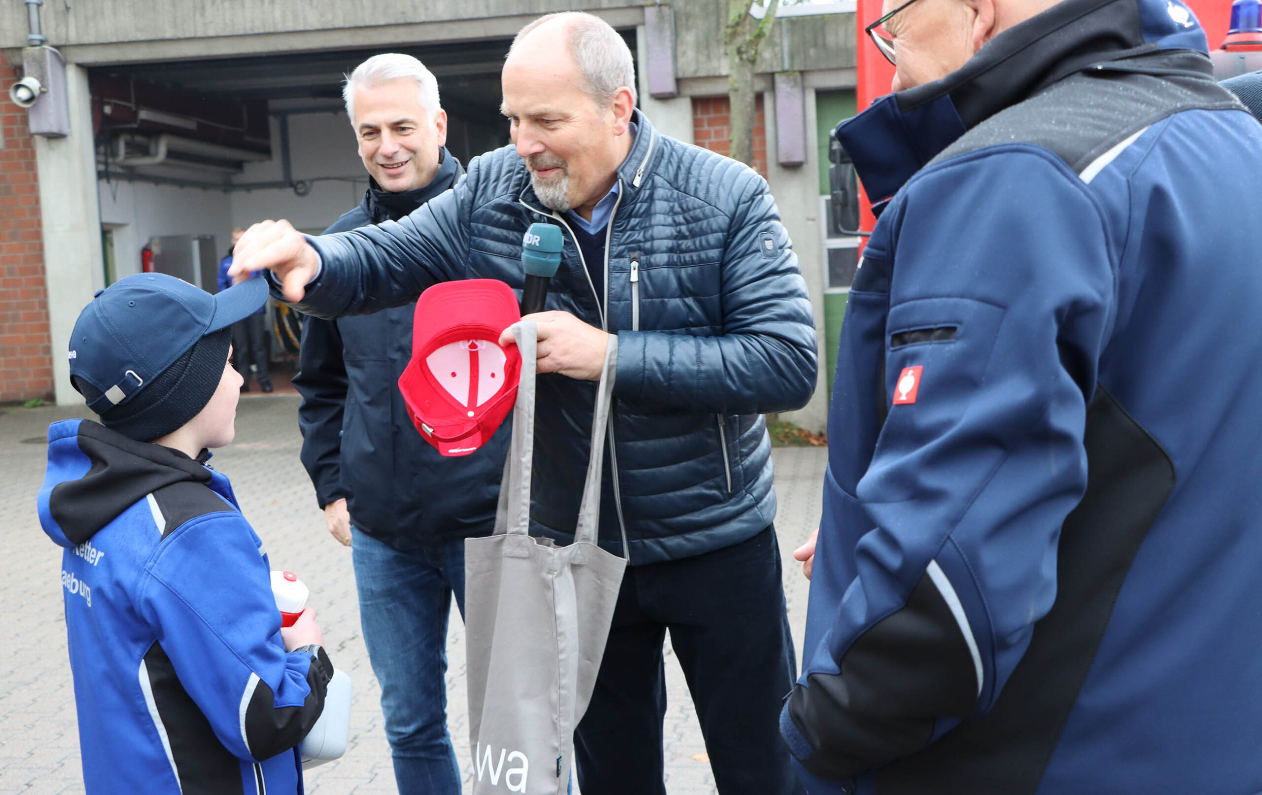 Kurz nach Mittag ließ Wehrführer Lars Heuer die Kinder auf dem Hof der Feuerwache antreten. Zahlreiche Gäste waren erschienen, um sich dieses Spektakel nicht entgehen zu lassen. Eltern, Familie, Förderer, die Stadtpräsidentin Elif Karagöz, Mitglieder der aktiven Wehr und die Presse blickten gespannt auf den Hof. Nach einer kurzen Begrüßung und ein paar einleitenden Worten, bat Heuer die Kinder Ihr neues Fahrzeug zu präsentieren. Unter epischer Musik und Theaternebel führen die Mini-Retter stolz ihr „LF XXS“ auf den Hof. Nun ergriff der Vorsitzende des Fördervereins Ernst-Wilhelm Schulze das Wort. Er bedankte sich bei allen Anwesenden und erklärte, dass es ihn freute und mit Stolz erfülle, ein solches Projekt nun endlich zum Abschluss bringen und übergeben zu können. Auch bei den beiden anderen Sponsoren, der MEWA und der Kreissparkasse, bedankte er sich nochmals. Ohne ihre Unterstützung, wäre eine Realisierung nicht möglich gewesen. Er überreichte mit ihnen zusammen den offiziellen Schlüssel an Anja Pätzold. Auch die Werksleitung des MEWA-Standortes Lauenburgs, Jörg Naegeli und Detlef Glimm, ließ es sich nicht nehmen ein paare Worte zu sagen. Gerne haben sie das Projekt unterstützt und seien stolz darauf, den Mini-Rettern ein solches Fahrzeug ermöglicht zu haben. Auch bei anderen Projekten konnte sich die Feuerwehr Lauenburg über eine Spende der MEWA freuen. Doch damit nicht genug. Beide hatten noch Trinkflaschen, Brotdosen und Caps für die Kinder dabei, die sie verteilten. Aber dann war genug der Worte. Nun konnte jeder, der wollte, sich das neue Fahrzeug auf nächster Nähe betrachten. Für das leibliche Wohl war ebenfalls gesorgt. Es gab Pommes Frites, Bratwurst und heißen Glühwein, Punsch, Kakao und Softgetränke, ebenfalls vom Förderverein gesponsert.
