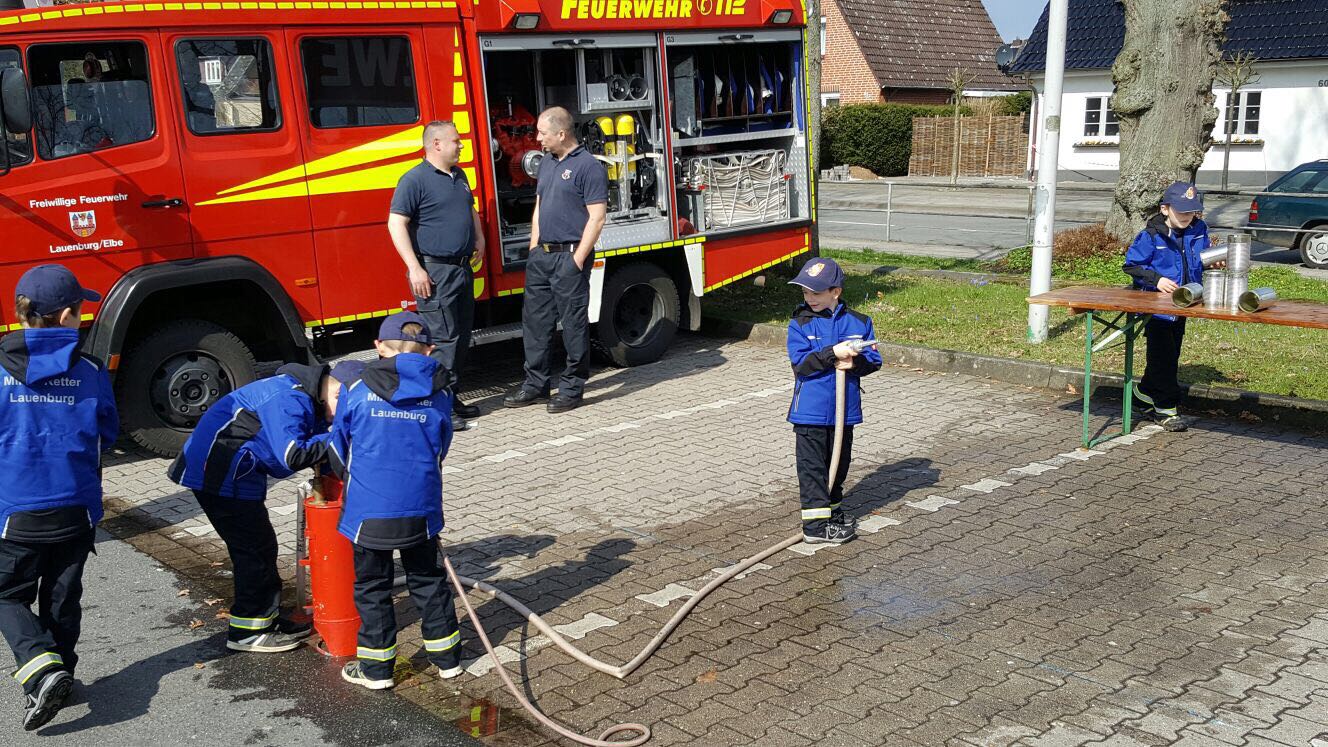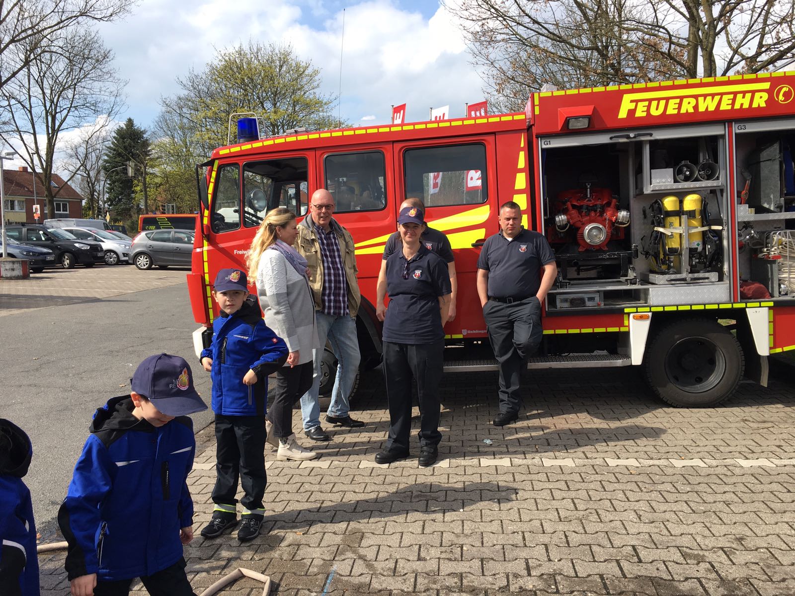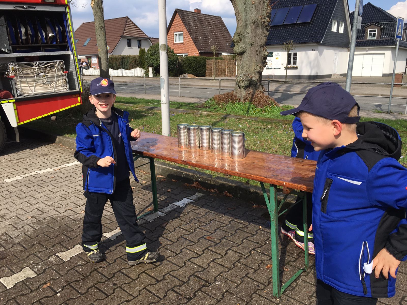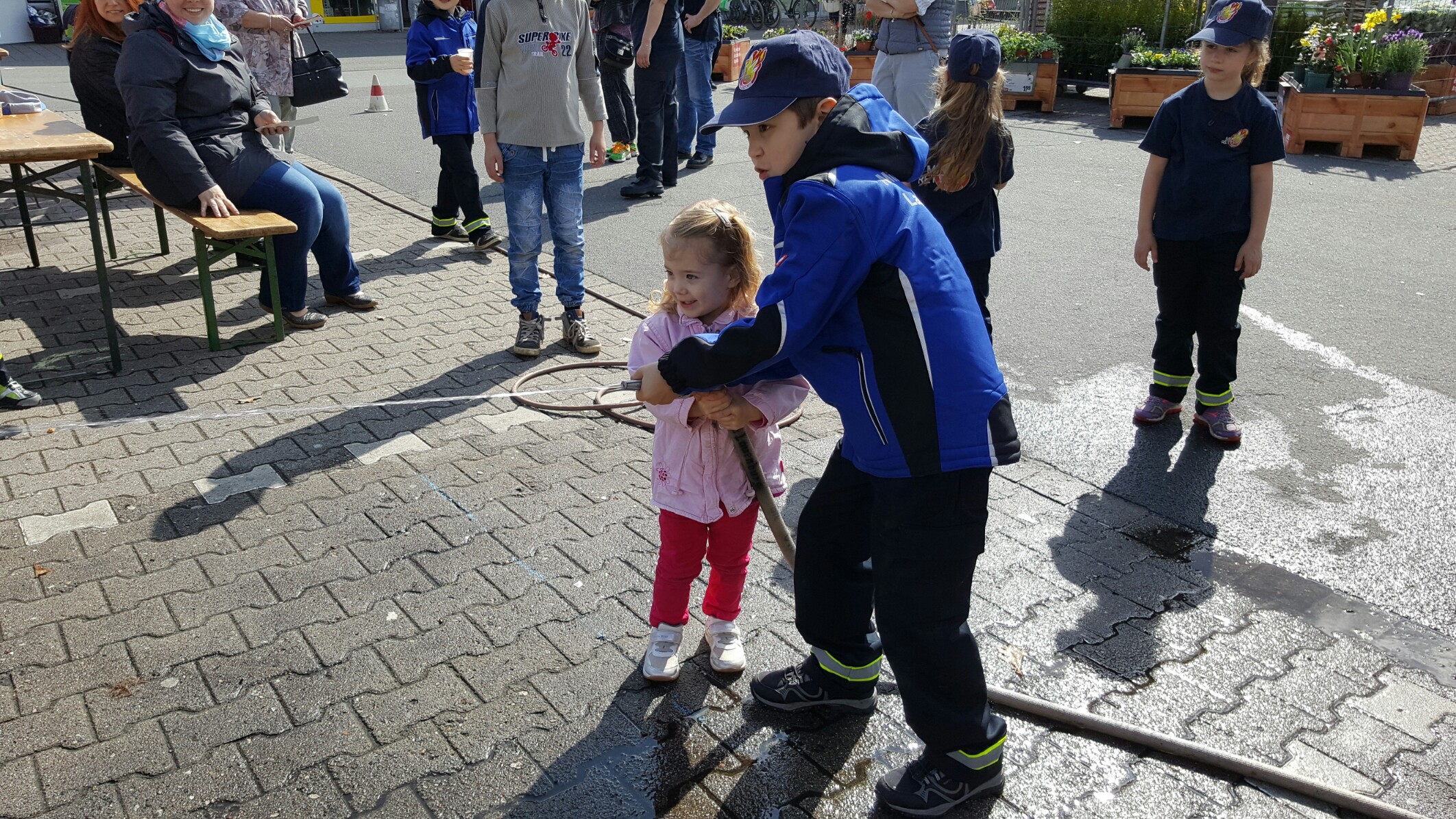 Am Sonntag, den 2. April, durften sich die Mini-Retter beim verkaufsoffenen Sonntag auf dem Rewe Gelände präsentieren. Während Eltern und Betreuer Grillwürste verkauften, konnten die Kinder mit einer Kübelspritze auf leere Dosen schießen. Die Mini-Retter zeigten auch anderen interessierten Kindern das bereit stehende LF8. Bei allerbestem Wetter kamen viele Besucher, so dass alle Würstchen, die von Rewe gespendet wurden, im Laufe des Tages verkauft wurden.