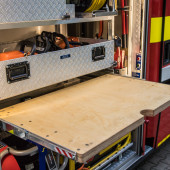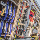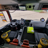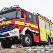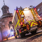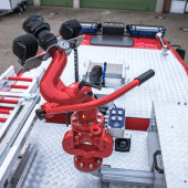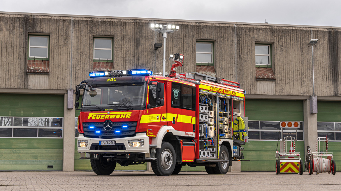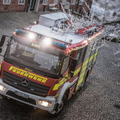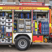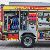 Das LF 20 von Schlingmann aus der Baureihe Varus ist das neuste Fahrzeug im Löschzug der Feuerwehr Lauenburg. Mit 3600l Löschwasser und 120l Schaummittel führt das Großfahrzeug die größte Menge an Löschmitteln in unserer Wehr mit sich. Neben der Standardbeladung des Löschgruppenfahrzeug 20 ist zahlreiche Zusatzbeladung verlastet. In einer V-Box kann ein Überdruckbelüfter in Stellung gebracht werden. Über Lutten kann das gezielt Brandrauch entlüftet und ins freie geleitet werden. Weiter steht umfangreiches Material zur technischen Hilfeleistung zur Verfügung. Gleich zwei Tauchpumpen mit bis zu 1200l/min Förderleistung können für den Lenzeinsatz in Betrieb und direkt durch ein auf dem Fahrzeug verlasteten Stromerzeuger betrieben werden. Für den Brandeinsatz können sich bereits auf der Anfahrt vier Atemschutzgeräteträger in der Mannschaftskabine ausrüsten. Nach dem Eintreffen, rüstet sich der 1. Trupp am G5 aus. Hier ist auf einem Auszug alles für den Löschangriff verlastet: Schlauchpaket, Brechwerkzeug, Schlauchtragekorb mit Rauchvorhang, Fluchthaube, Leinenbeutel. - Der 2. Trupp kann sich mit der Atemschutznotfalltasche ausrüsten und steht sofort als Sicherheitstrupp zur Verfügung. Für den Ernstfall ist auf dem LF 20 neben einem Notfallrucksack auch ein AED (Automatisch externer Defibrillator) verlastet. Eine LED Großflächenleuchte vom Typ "Elspro N8 LED" macht die Nacht zum Tag, wahlweise kann sie auf einem Stativ oder mit einer Kette unter dem Korb der Drehleiter montiert werden. Mit ihren 30.000 Lumen strahlt sie die Einsatzstelle blendfrei aus. Bei Großbränden kann mit dem LF 20 ein massiver Löschangriff vorgenommen werden. Auf dem Dach ist ein fester Wasserwerfer von Alco mit einer maximalen Durchflussmenge von 2600l/min montiert. Die Durchflussmenge kann reguliert werden, sodass er dank des "Pump and Roll" Systems auch bei Flächen oder Böschungsbränden während der Fahrt zum Einsatz kommen kann. Zudem steht ein mobiler Wasserwerfer von AWG Typ Turbofighter MZ2000 mit einem maximalen Durchfluss von 2000l/min und zwei Leader B-Rohre Typ Quadra Fog 1000 mit je 950l/min Verfügung. Mit einem Düsenschlauch kann eine Wasserwand auf 20m Länge aufgebaut werden. Eine Wasserwand kann dann beispielsweise in den engen Twieten der Lauenburger Altstadt ein Übergreifen der Flammen auf ein Nachbarhaus verhindern. Mit einer EPH Verkehr Plus von Barth kann ein Feuerwehrangehöriger allein die Absicherung der Einsatzstelle übernehmen. Auf der Haspel ist neben drei Faltleitkegeln und 4 Euro-Blitzleuchten eine Warnleuchte montiert. Mit der zusätzlichen Warnmakierung fällt sie im Verkehr auf und warnt Autofahrer vor der Gefahr.