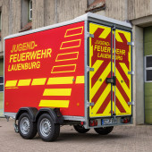 Die Jugendfeuerwehr bekam dank Spenden Lauenburger Firmen rechtzeitig zum Kreiszeltlager einen neuen Anhänger. Der Böckmann Zweiachser hat einen Kofferaufbau und wurde durch Bruns-Werbung im Lauenburger Design beklebt. So passt er perfekt hinter das MTF. Der Anhänger hat eine maximale Nutzlast von 2,7t. Die Jugendfeuerwehr stellt den Anhänger natürlich auch der aktiven Wehr zur Verfügung. Etwa zum Transport eines Stromerzeugers, die mit dem Gabelstapler bequem verladen und anschließend über Zurrösen im Boden gesichert werden kann.