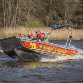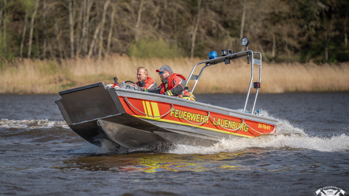 Das neuere Boot in unserer Wehr wurde 2015 der Feuerwehr Lauenburg übergeben. Ein Alu Leichtbau ermöglicht ein geringes Gewicht. Mit seinen gut 6m Länge und rund 2m Breite bringt es gerade einmal 370kg auf die Waage. Dank seines flachen Rumpfes hat es einen geringen Tiefgang und ist so besonders für den Einsatz beim Hochwasser geeignet. Dank einer Bugklappe können Geräte oder Gegenstände einfach ins Boot gezogen werden. Ein ebener Boden Macht den Transport von Material möglich.