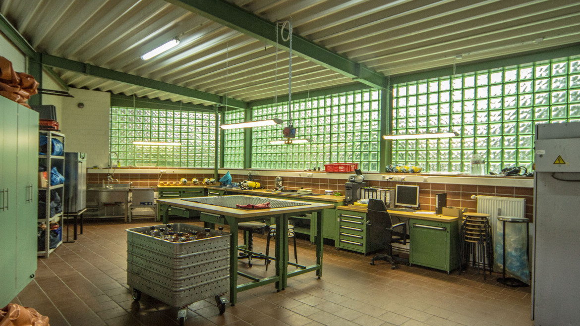 In der Atemschutzwerkstatt bereiten die Gerätewarte im Einsatz verwendete Pressluftatmer und Masken wieder auf, reinigen und warten sie. In speziellen Becken werden die Masken ultraschallgereinigt und anschließend in einem modernen Trockenschrank schonend von Reinigungsspuren befreit. Zudem lagern hier Ersatzflaschen und Atemschutzmasken für den Einsatz. Die Werkstatt befindet sich in einem Nebentrakt vom Neubau.