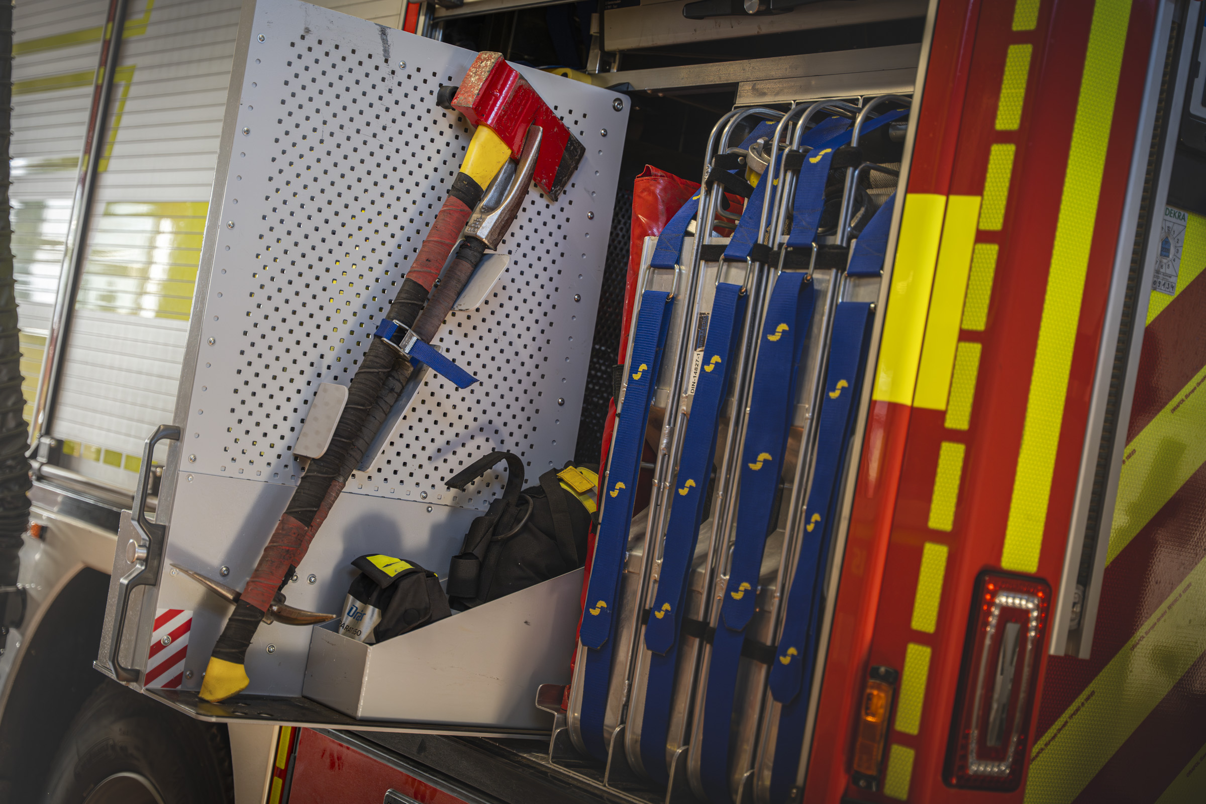 Bei uns kommt die Top-Cut Axt zum Einsatz, eine Kombination aus Spaltaxt und Hammer, dabei jedoch sehr leicht. Das Halligan-Tool kann ebenso auch bei Verkehrsunfällen zum Einsatz kommen, so bietet es ein Wiederlager für den Hydraulikstempel, sollte die B-Säule schon entfernt worden sein. Bereits beim schaffen einer Versorgungsöffnung können langwierige Prozeduren mit dem Spreizer umgangen werden. Durch Eintreiben des Dorns in die Kotflügel und eine einfache Hebelbewegung schafft man einen Spalt um an die Schaniere der Fahrertür zu gelangen. Durch vielseitige Einsetzbarkeit zeichnen sich beide Werkzeuge aus und gehören dadurch zur Ausstattung des HLF.