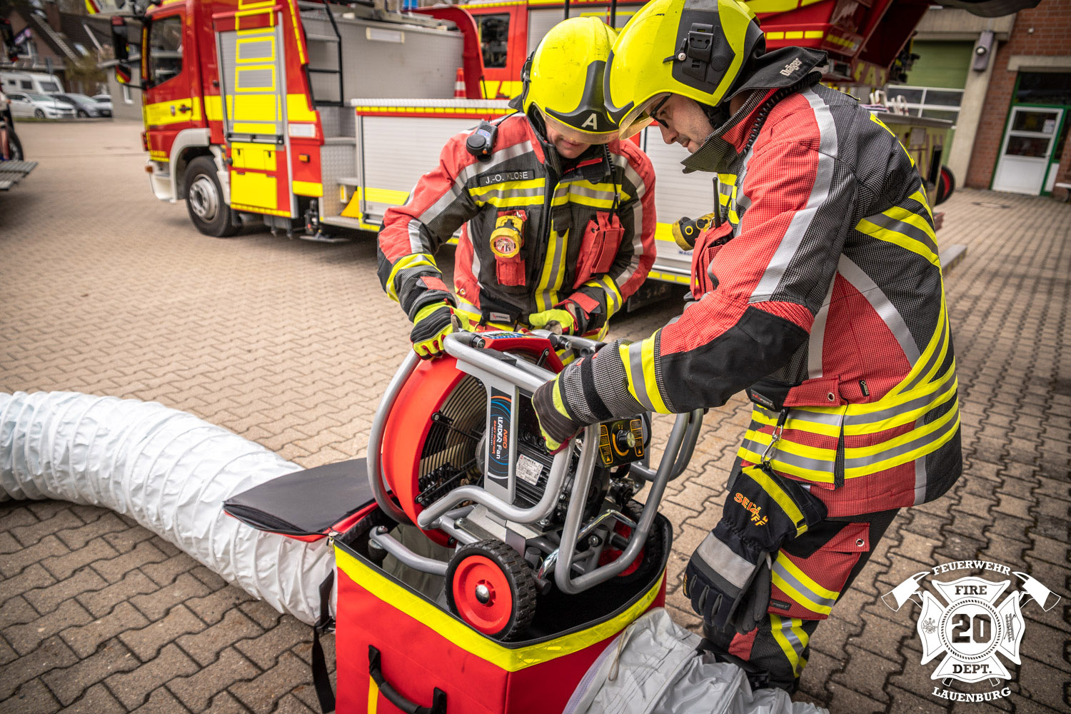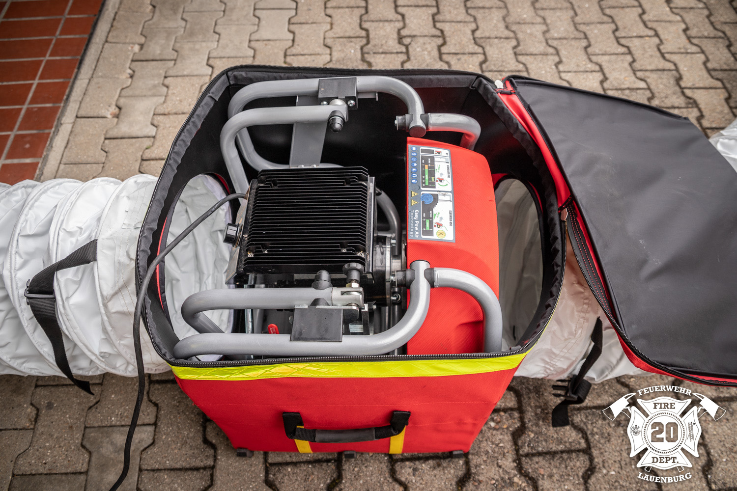 Zur Belüftung und Entlüftung verrauchter oder schlecht mit Sauerstoff versorgter Gebäudeteile kann die Leader V-Box eingesetzt werden. Auf dem LF 20 wird der Kubus samt Drucklutten mitgeführt. Mit Zwei Einsatzkräften kann die Box aufgebaut werden. Die weißen Lutten sind Luftschläuche, die mittels Reißverschlusses an die V-Box angeschlossen werden. Dabei können die Lutten, abhängig von der Leistung des Lüfters, miteinander verbunden und verlängert werden. In die V-Box wird ein Elektrolüfter gestellt, das Kabel kann aus einer Öffnung im Reißverschluss herausgeführt werden. Je nach Positionierung des Lüfters kann nun zum Beispiel Brandrauch angesaugt und nach außen transportiert werden, oder aber Frischluft von außen über die Lutten in ein Gebäude geblasen werden. Passende Überdruckbelüfter werden auf mehreren Fahrzeugen wie dem LF 20, der Drehleiter oder dem HLF mitgeführt.