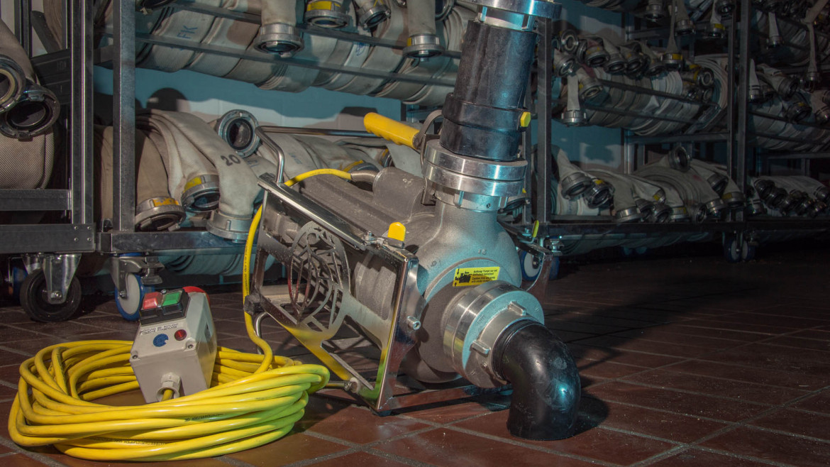 Gleich mehrere Schmutzwasserpumpen mit der Bezeichnung „Chiemsee“ stehen der Feuerwehr zur Verfügung. Um bei Hochwasser oder Unwetterlagen Wasser aus Kellern oder anderen unterflur liegenden Gebieten zu pumpen greifen wir neben Tauchpumpen auch auf Schmutzwasserpumpen zurück. Blätter, Sand und kleine Stöcker sind kein Problem für die krisenerprobten Geräte. Über zwei unterschiedliche Größen verfügt die Feuerwehr Lauenburg, so führen wir auf dem LF16 eine Pumpe mit einer Förderleistung von 1600l/min mit. Auf mehreren Rollcontainern stehen für größere Einsätze Pumpen mit einer Leistung von 2500l/min zur Verfügung. Sogar Tennisbälle sind für leistungsstarke Schaufelradpumpe kein Problem, sie werden mit dem Schmutzwasser über einen formstabilen Schlauch aus dem Gefahrenbereich geleitet. Die Pumpen von Firma Spechtenhauser sind weit im Katastrophenschutz verbreitet. Durch verschiedene Möglichkeiten zur Anwendung ist es Möglich das Wasser bis auf wenige Millimeter aus einem Kellerraum zu fördern. Die Pumpe ist voll tauchfähig und kann vollständig im Schmutzwasser versenkt werden.