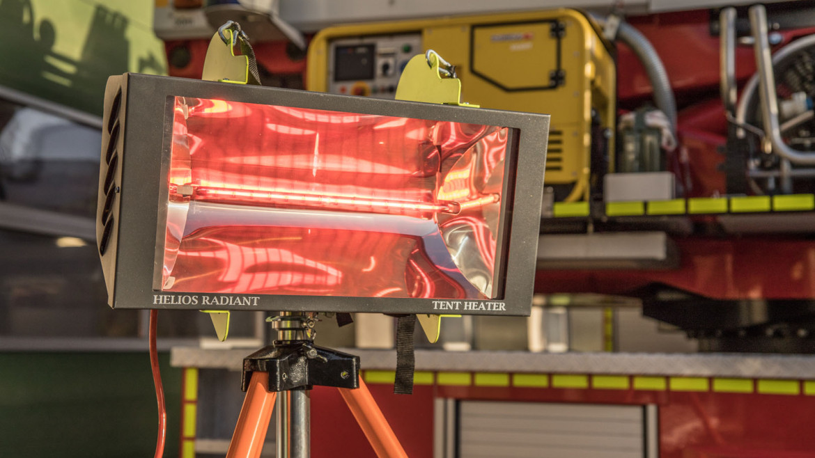Mit dem neuen ELW kam auch ein Heizstrahler mit vielseitigen Einsatzmöglichkeiten. Der "Helios Radiant Tent Heather" kann zum Beispiel als Heizung für das auf dem ELW mitgeführte Vorzelt genutzt werden. Durch die einfach Aufhängung kann er leicht im inneren montiert werden. Geräuschlos sorgt er innerhalb von Sekunden für wärme im Vorzelt, etwa bei Besprechungen der Einsatzleitung, oder Regeneration der Einsatzkräfte. Über den 230V Anschluss kann er über einen Generator angetrieben werden und wenn nicht am Gestänge auf einem Stativ montiert werden.