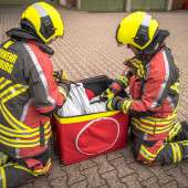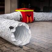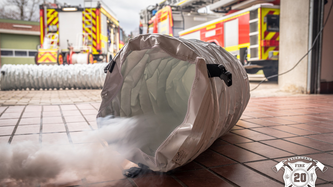 Zur Belüftung und Entlüftung verrauchter oder schlecht mit Sauerstoff versorgter Gebäudeteile kann die Leader V-Box eingesetzt werden. Auf dem LF 20 wird der Kubus samt Drucklutten mitgeführt. Mit Zwei Einsatzkräften kann die Box aufgebaut werden. Die weißen Lutten sind Luftschläuche, die mittels Reißverschlusses an die V-Box angeschlossen werden. Dabei können die Lutten, abhängig von der Leistung des Lüfters, miteinander verbunden und verlängert werden. In die V-Box wird ein Elektrolüfter gestellt, das Kabel kann aus einer Öffnung im Reißverschluss herausgeführt werden. Je nach Positionierung des Lüfters kann nun zum Beispiel Brandrauch angesaugt und nach außen transportiert werden, oder aber Frischluft von außen über die Lutten in ein Gebäude geblasen werden. Passende Überdruckbelüfter werden auf mehreren Fahrzeugen wie dem LF 20, der Drehleiter oder dem HLF mitgeführt.