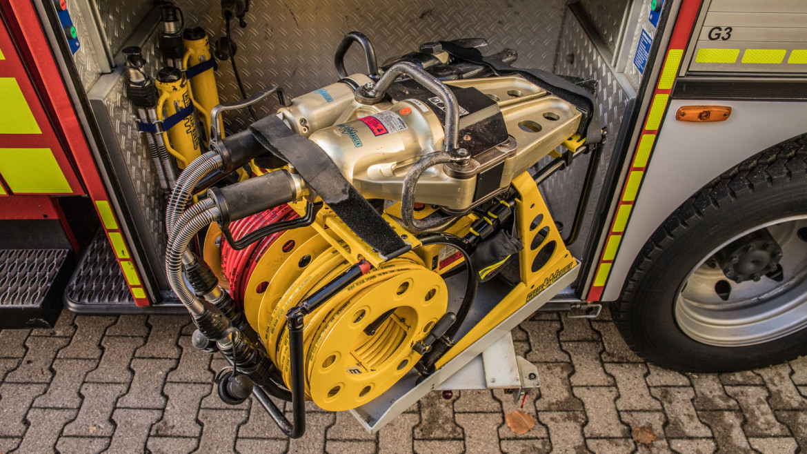 Ergänzend zum Rettungssatz auf dem HLF ist der Rettungssatz auf dem TLF aufgebaut. Weshalb hier ein noch leistungsstärkerer Spreizer mitgeführt wird. Der SP60 ist einer der leistungsstärksten überhaupt. Mit einer maximalen Spreizkraft von über 49t eignet er sich besonders für den Einsatz an massiven LKW Karossen. Als Feuerwehr an gleich mehreren viel befahrenden Bundesstraße muss jederzeit mit einem schweren Verkehrsunfall im Lastenverkehr gerechnet werden. Die enormen Kräfte sind dann erforderlich, da auch die Fahrzeughersteller immer stärkere und härtere Materialien nutzen, um die Fahrgastzelle sicherer aufzubauen. Bei einem maximalen Öffnungsweg von 810mm hebt das Werkzeug ein Gewicht von immer noch über 9t. Die maximalkraft von über 49t erreicht der Spreizer bei der Auflage des Gewichtes auf den Armen.