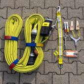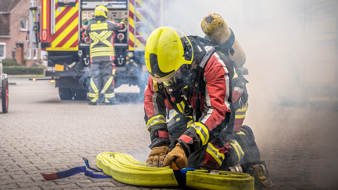 Für das Schlauchmanagement in engen Treppenhäusern nutzen wir das inzwischen weit verbreitete Schlauchpaket. Ein 30m C-Druckschlauch in Signalfarbe Gelb soll auch bei der Orientierung im Brandrauch helfen. Der in Ringen verpacke Schlauch wird mit mehreren Klett-Bändern zusammen gehalten und bis zum Einsatzort etwa einer Wohnungstür in einem Mehrfamilienhaus getragen. Die Klettbänder werden gelöst und an den Kugelhahn am Ende des Schlauches wird eine weitere C-Leitung angeschlossen. Durch langsames Öffnen füllt sich der Schlauch, mehrere Ringe entstehen die anschließend durch den Wasserdruck bestehen bleiben. Durch die stabile Form können sie zum Beispiel im Treppenhaus platzsparend an der Wand angelehnt werden. Mit dem im Schlauchpaket integrierten Hohlstrahlrohr kann der Trupp vorgehen, der Schlauch zieht sich dank der Ringe problemlos hinterher.