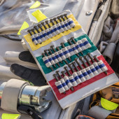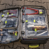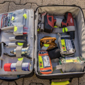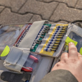 Auf einem Magazin für Schneidschrauben werden die verschiedenen Stärken übersichtlich mitgeführt. Sie fliegen nicht lose im Rucksack oder Koffer umher. Im Boden des Rucksack kann mit Klettschlaufen der Akku-Bohrer fixiert werden. PAX-Taschen verstauen weitere Kleinteile wie Bits und Schließzylinder.