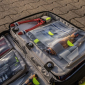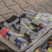 Auf der Oberseite der Mittelwand finden Sperrigere Utensilien ihren Platz. Ein kleiner Bolzenschneider zum durchtrennen von Sperrketten, Klarsichttaschen mit einer Einsteckkarte für ein Set Dietriche und Fallenheber. Eine weitere Tasche bietet Platz für zwei Fensteröffner, getrennt durch einen Mittelsteg.